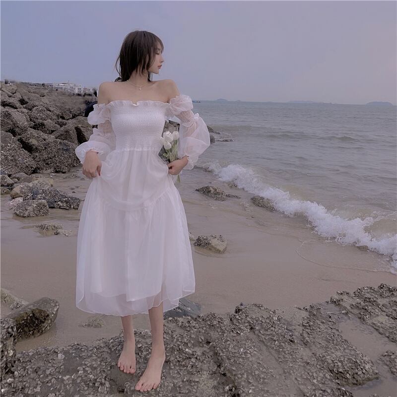 送料無料୨♥୧ 2021サマーレディースマキシホワイトビーチドレス スラッシュ首オフショルダーボディコンロリータ甘い可愛いフリルパーティーロング AOS3175795780