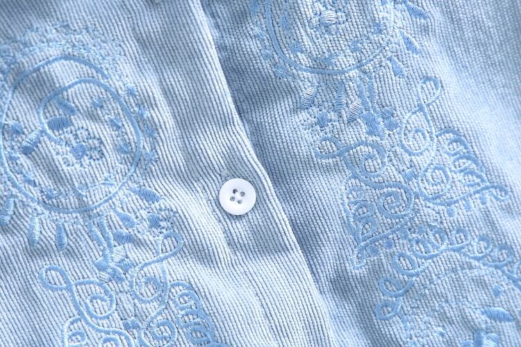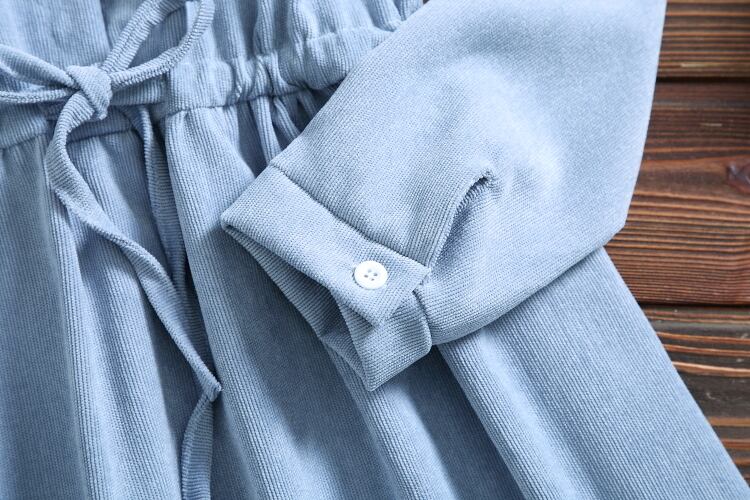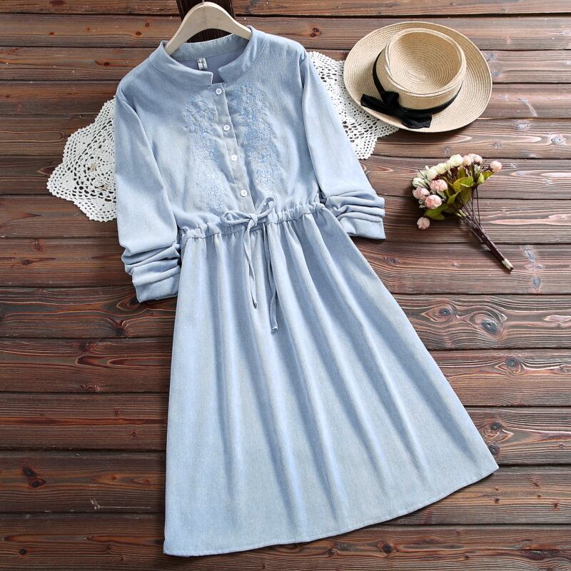 送料無料୨♥୧ オータムスプリングレディース甘いドレス スタンドカラーカラーブルーイエローレースアップ長袖スリーブフローラル刺繍コーデュロイ可愛いドレス ワンピース AOS49718646904