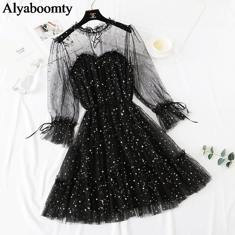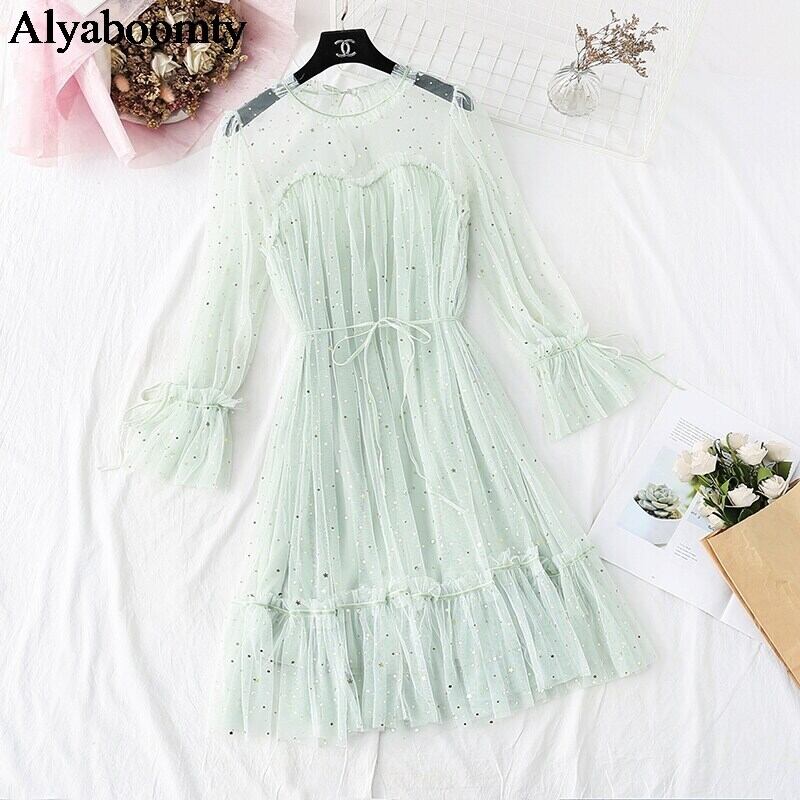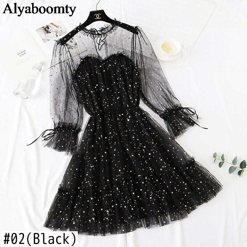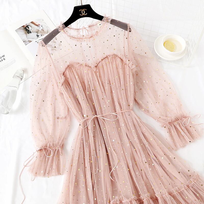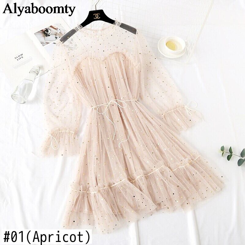 送料無料୨♥୧ シックスプリング秋レディース妖精ドレス ピンクグレーブラックブルーアプリコット月出演者ドットフリルチュール AOS43465330696