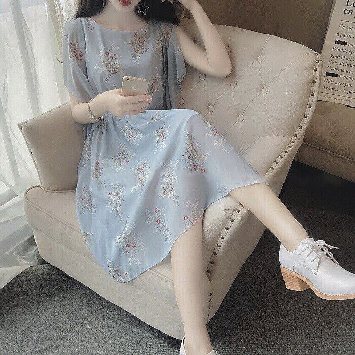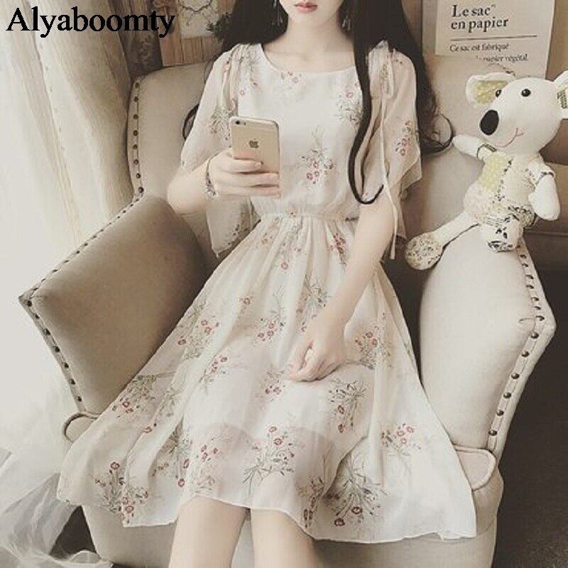 送料無料୨♥୧ シックサマーレディースoフローラルドレス 首アプリコットブループリント柄半袖スリーブシフォン AOS12827524231