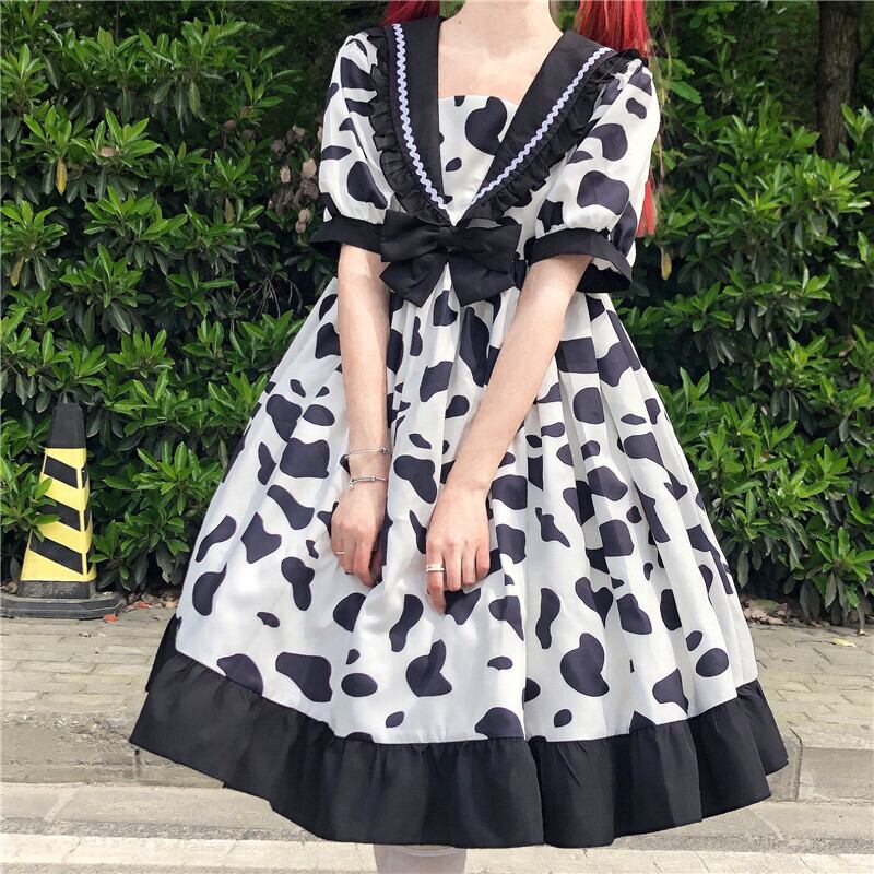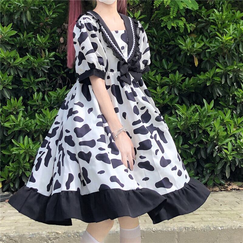 送料無料୨♥୧ 2021eseサマーレディースロリータドレス 船乗りカラーリボン牛プリント可愛いフリルのパーティー AOS79402354072
