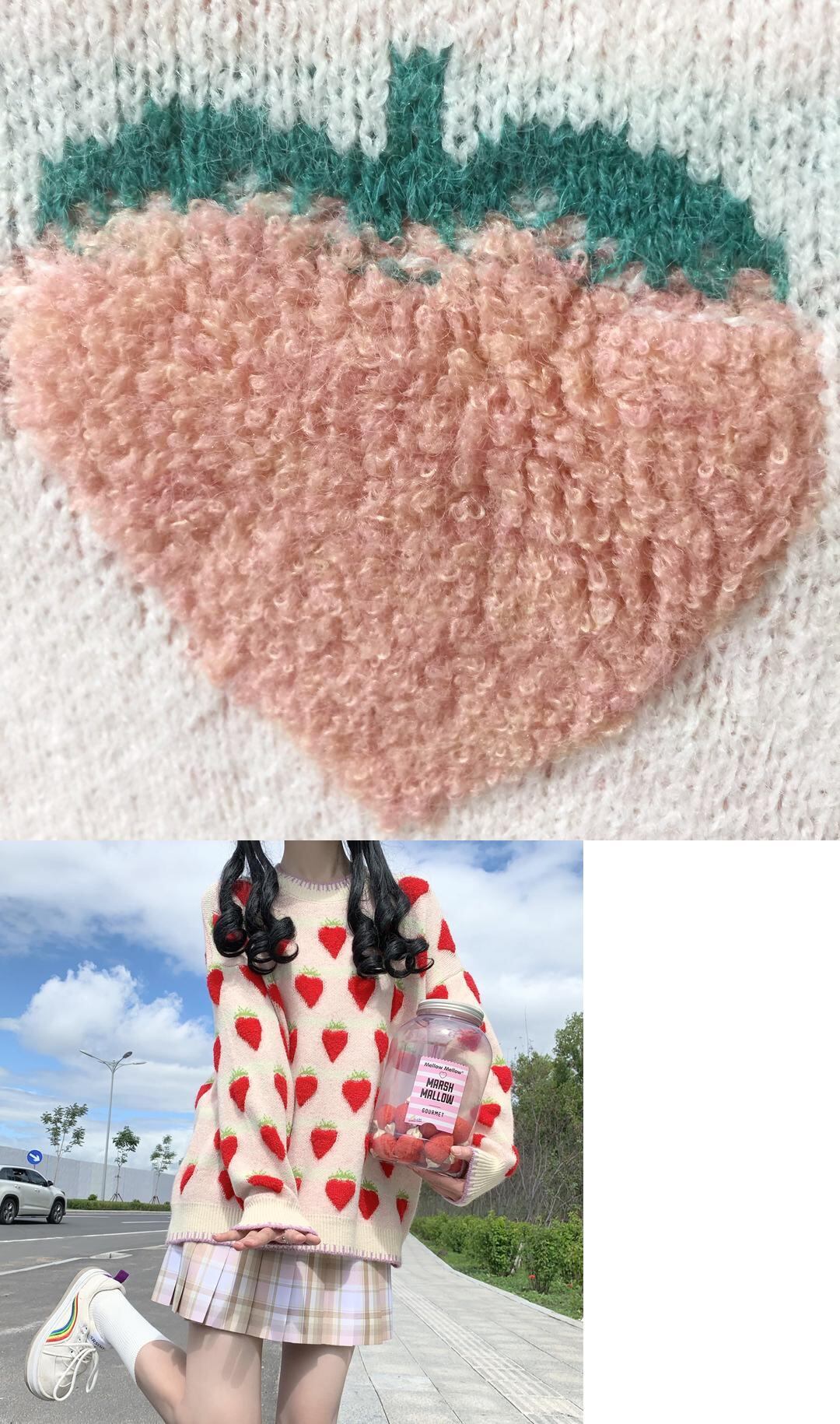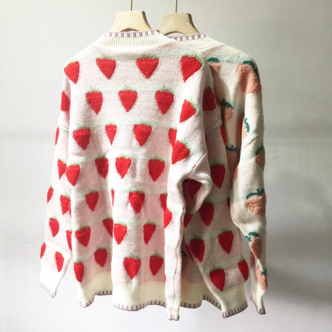 送料無料୨♥୧ プレッピースタイルスプリングオータムレディースo可愛いフルーツセーター 首桃イチゴルーズプルオーバー ロリータの AOS85547726085