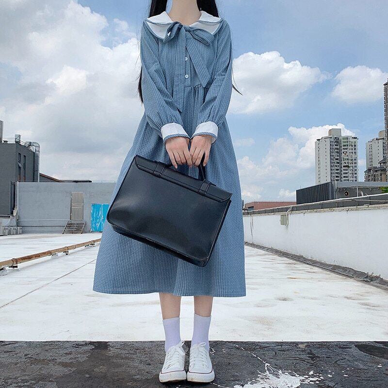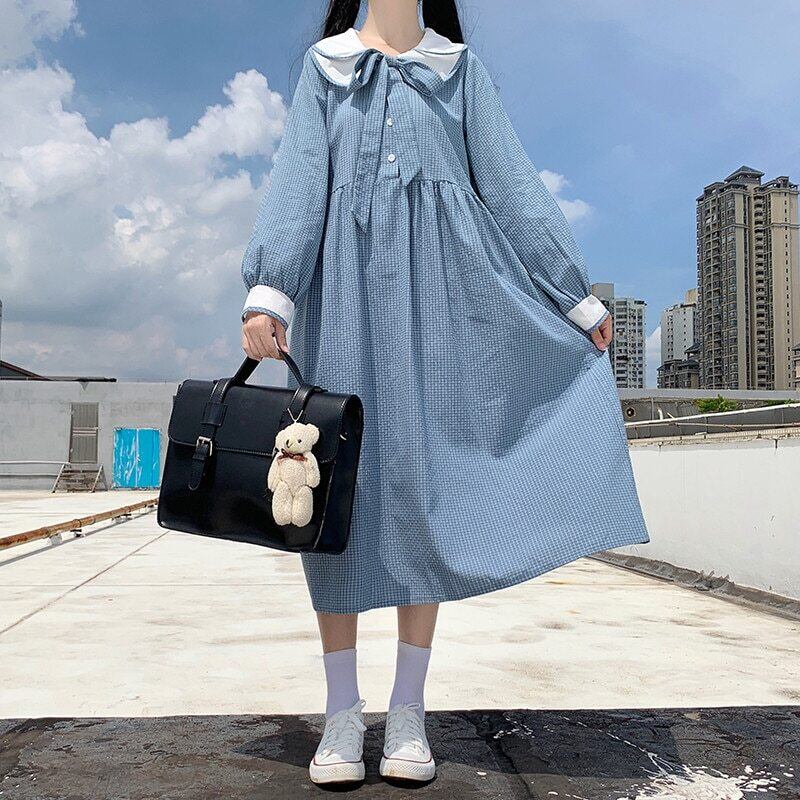 送料無料୨♥୧ ese森スプリング秋レディース服船乗りカラーリボンブルー格子柄ルーズドレス 長袖スリーブ可愛いミディ AOS45121311437