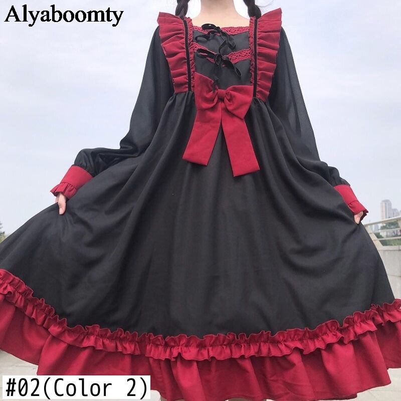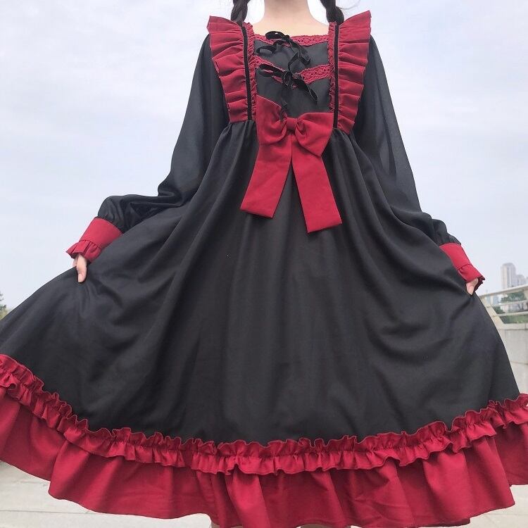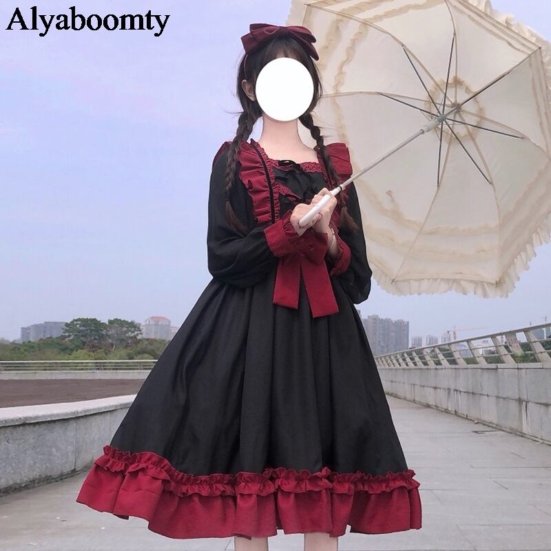 送料無料୨♥୧ eseロリータスタイルオータムスプリングレディースドレス 平方カラーコントラストリボン可愛いフリル AOS50157413026