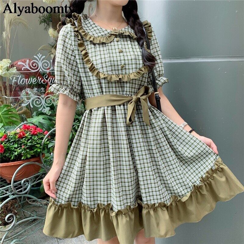 送料無料୨♥୧ サマーeseロリータドレス ピーターパンカラーグリーン格子柄パッチワークとサッシ半袖スリーブフリル AOS88102917234