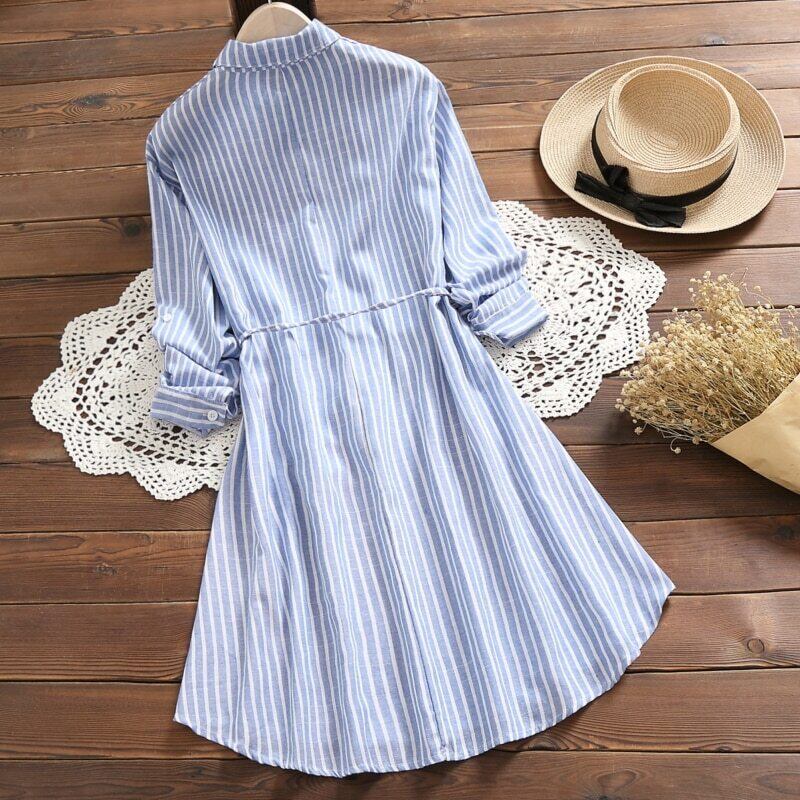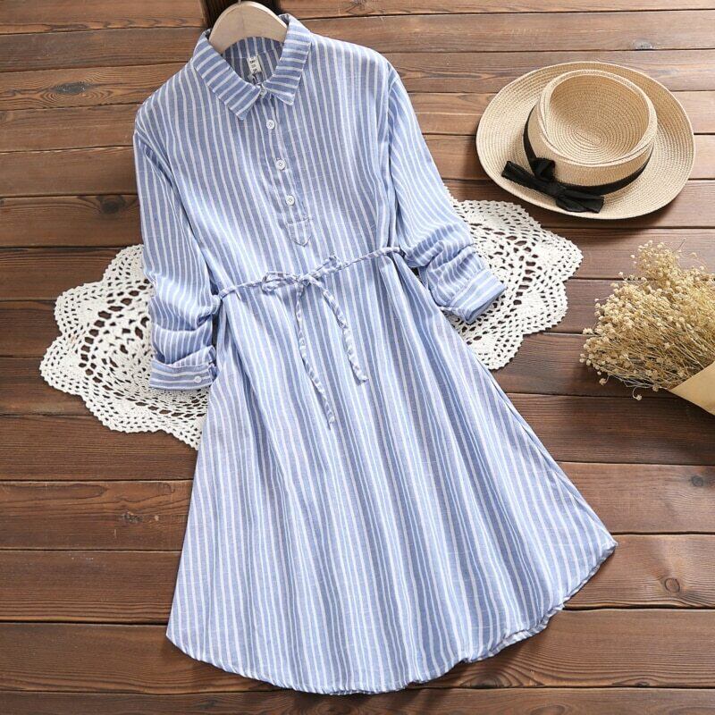 送料無料୨♥୧ 森スプリングオータムレディースシャツ ドレス 断るカラーブルーストライプヴィンテージ不規則な七部袖スリーブコットン AOS67363506426