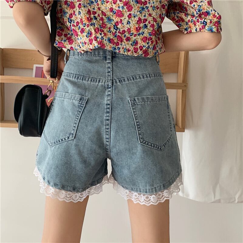 送料無料୨♥୧ 2021ese原宿サマーレディースストリートウェアデニムショーツ ウェストブルーパール可愛いレーススプリットまっすぐ AOS19440995507