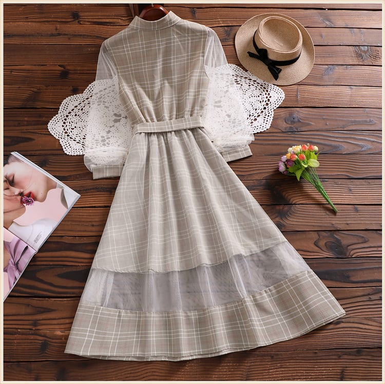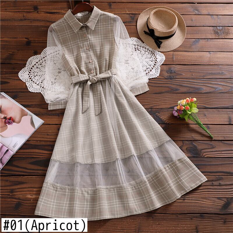 送料無料୨♥୧ 森オータムスプリングレディースロングチュールドレス 断るカラー格子柄アプリコットグレーピンクメッシュシックドレス ワンピース AOS11420800086