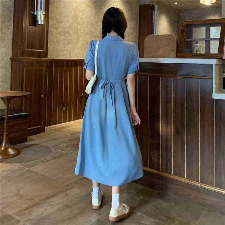 送料無料୨♥୧ シックサマーレディースAラインロングドレス 断るカラーブラックブルーソリッド サッシ半袖スリーブベスティドス AOS49219098529