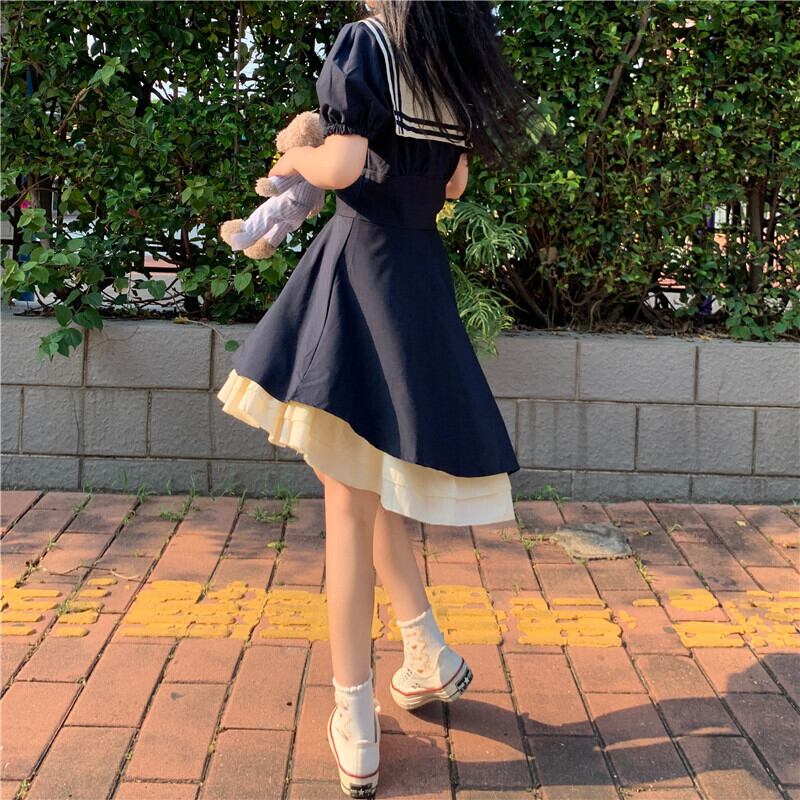 送料無料୨♥୧ 2021ese原宿サマーレディース不規則なドレス 船乗りカラーリボンネイビーブルーコスプレ可愛いフリルロリータ AOS25249001540