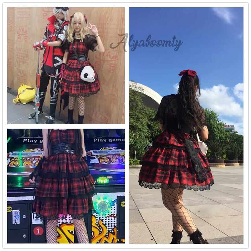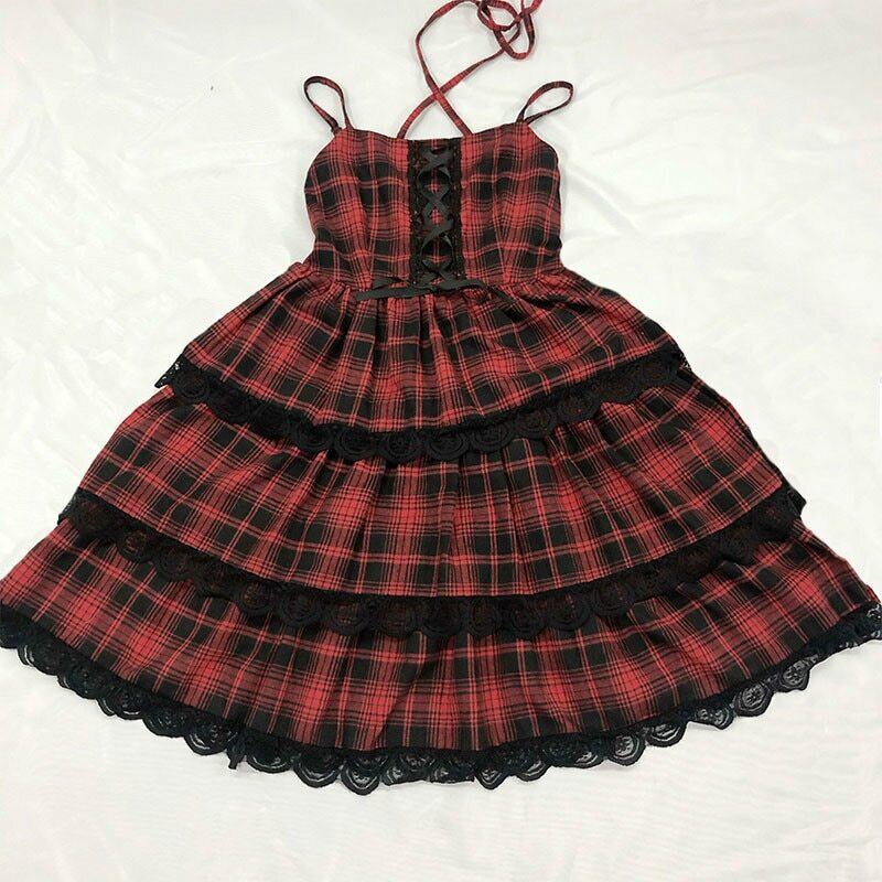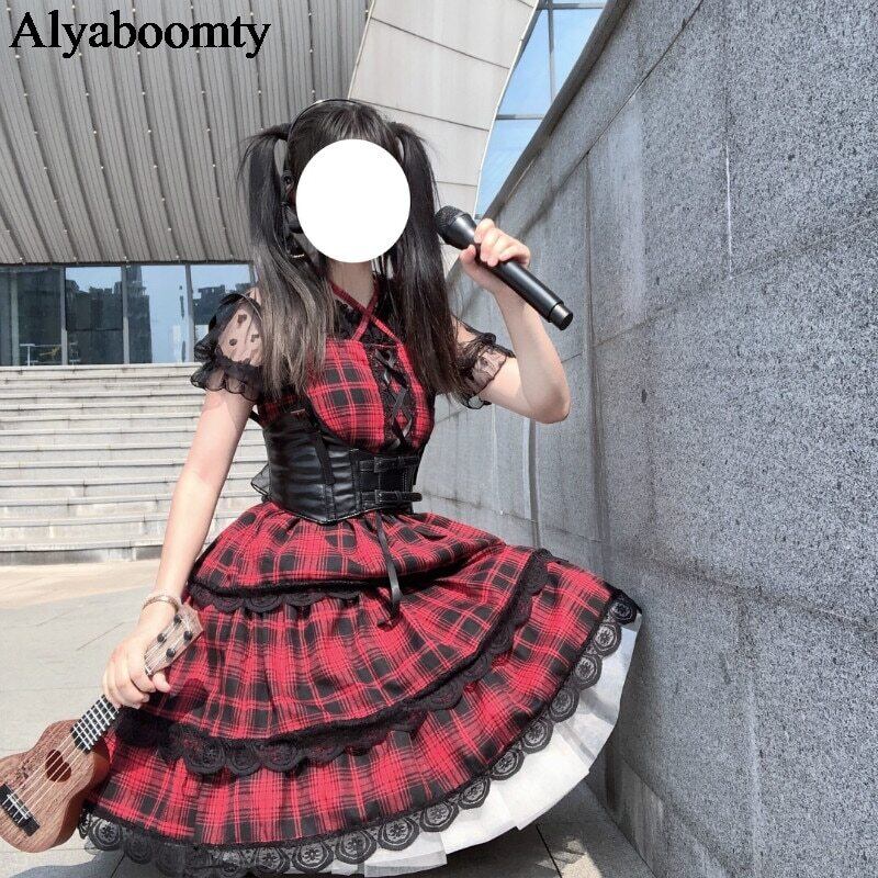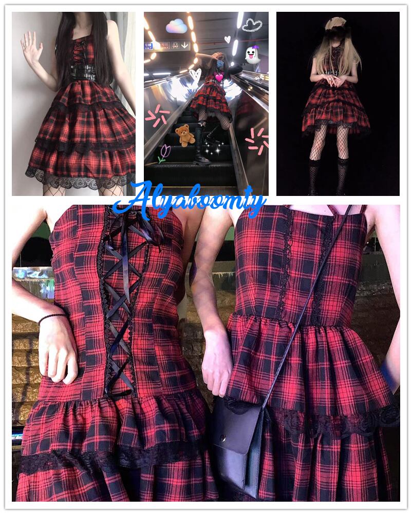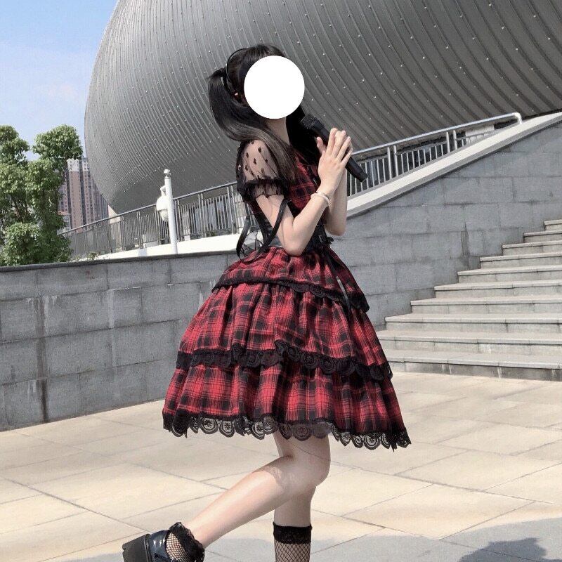 送料無料୨♥୧ ese原宿サマーレディースストリートウェアドレス レッド格子柄バンドゴシックレースフリルロリータ AOS55870106472