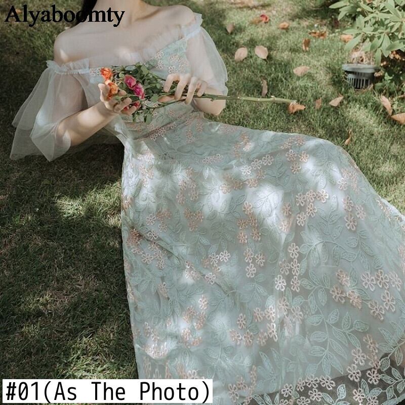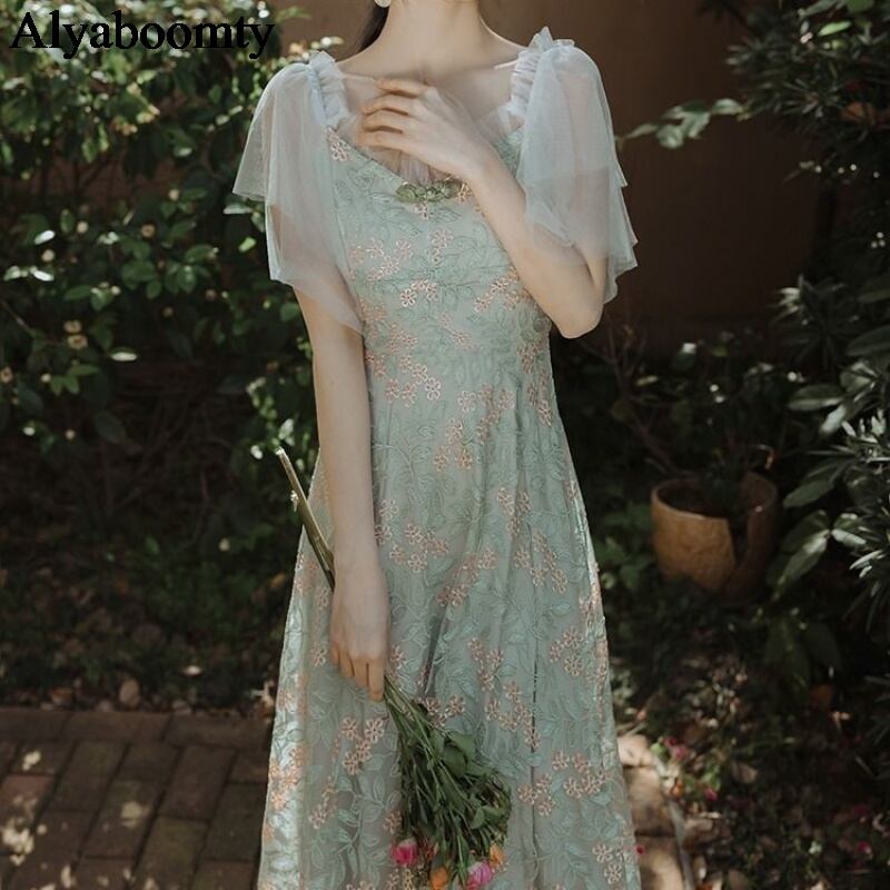 送料無料୨♥୧ 2021サマーレディースクリカルミディドレス カラーフローラル刺繍シック半袖スリーブメッシュパーティードレス ワンピース AOS96868112195