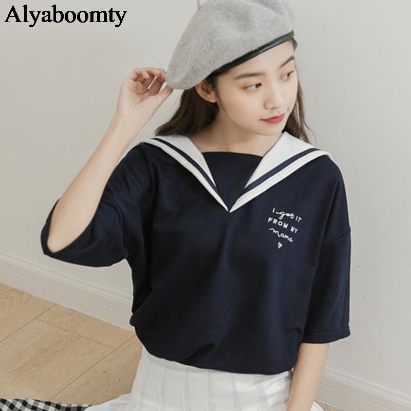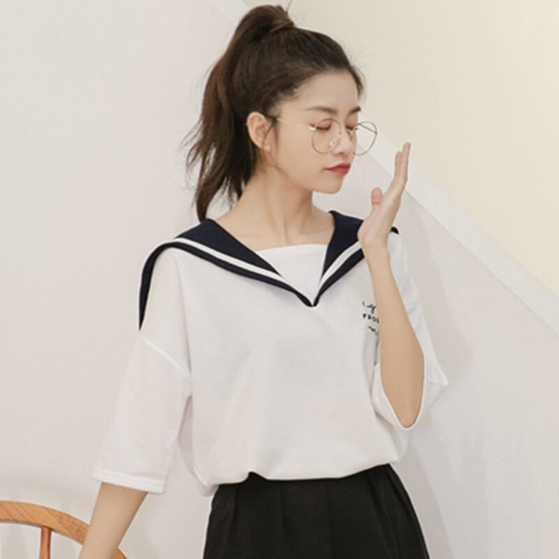 送料無料୨♥୧ ese原宿特大レディースティーシャツ 船乗りカラーホワイトネイビーブルー文字プリントTシャツ プレッピースタイルトップス AOS41707771447