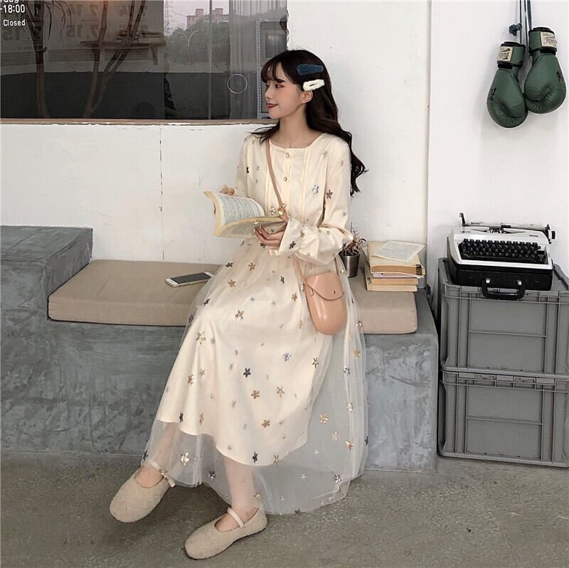 送料無料୨♥୧ 2021スプリングオータムレディースミディロリータドレス アプリコット出演者妖精シック甘いメッシュ2枚 AOS83475737275