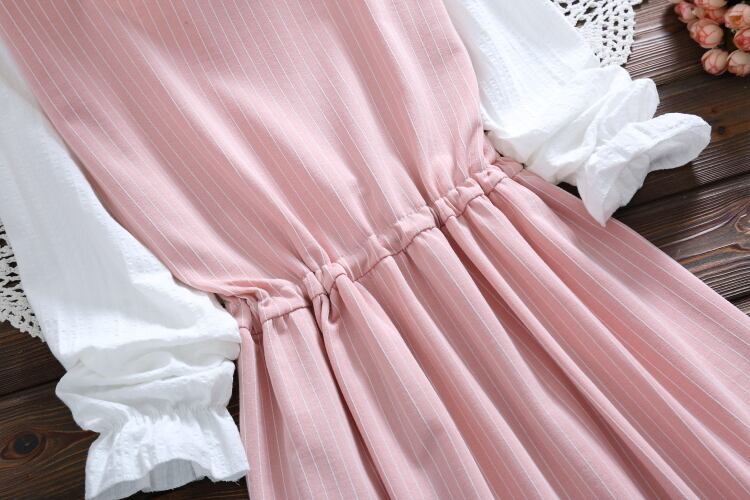 送料無料୨♥୧ プレッピースタイルスプリングオータムレディース可愛いドレス パッチワークピンクブルーリボンの長袖スリーブストライプ AOS67707700994
