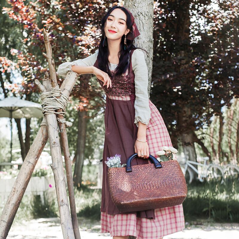 送料無料୨♥୧ ese森オータムスプリングレディースロングドレス 格子柄フローラルバンドベスティドスヴィンテージ草原シックコットン AOS26072126598