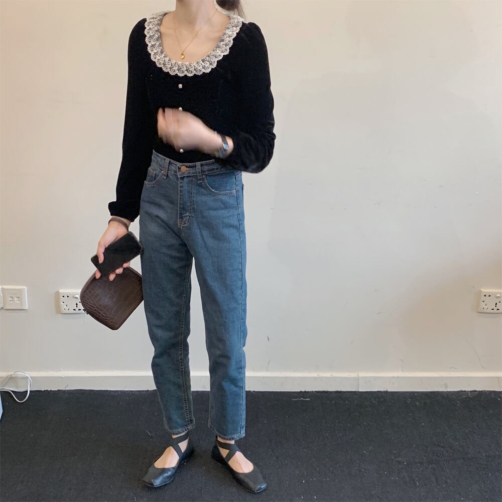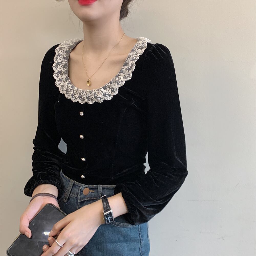 送料無料୨♥୧ オルチャンスプリングオータムレディースoブラウス レース首スリムブラックベルベットシャツ 長袖スリーブシャツ AOS59785322749