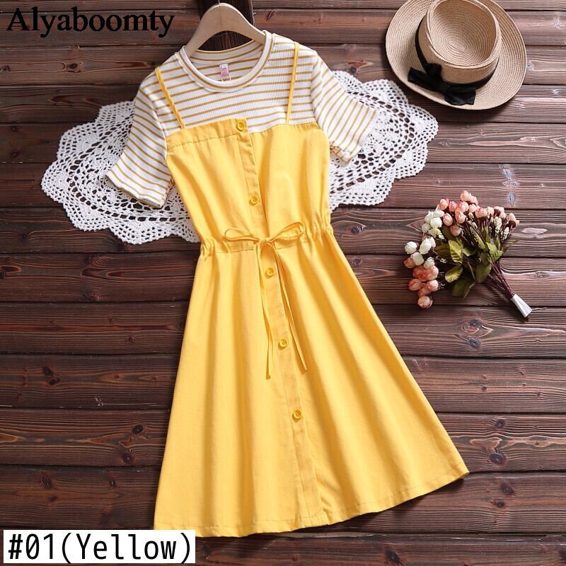 送料無料୨♥୧ eseプレッピースタイルサマーレディースoシャツ ドレス 首ニットストライプコットンパッチワークイエロー半袖スリーブ学生 AOS29010359826