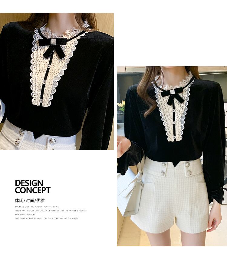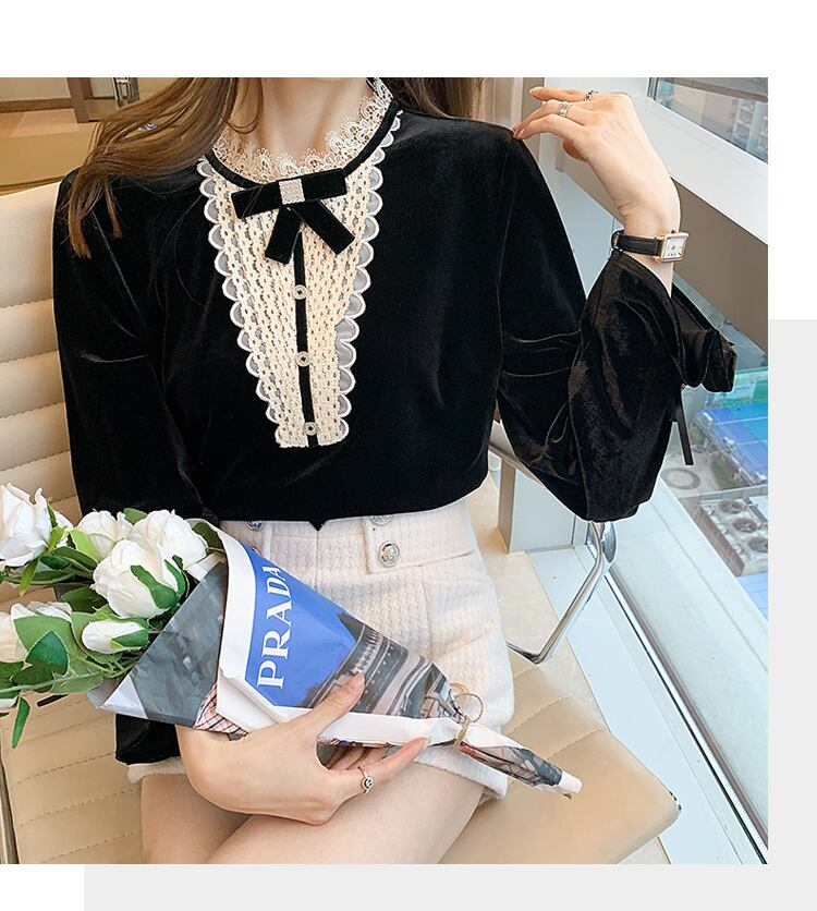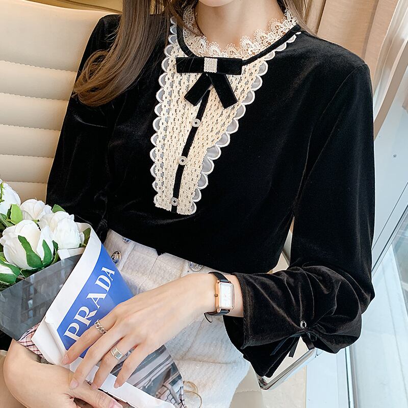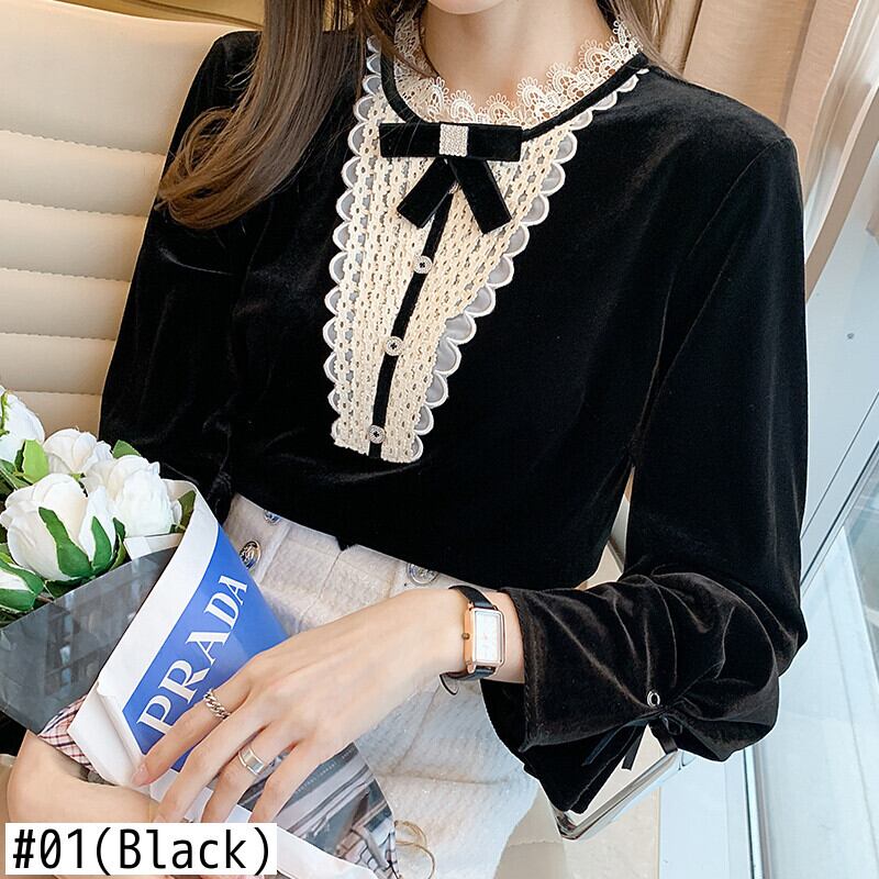 送料無料୨♥୧ 2021スプリングオータムレディースブラウス シックレースカラーリボンブラックベルベットシャツ 甘い AOS56883690553
