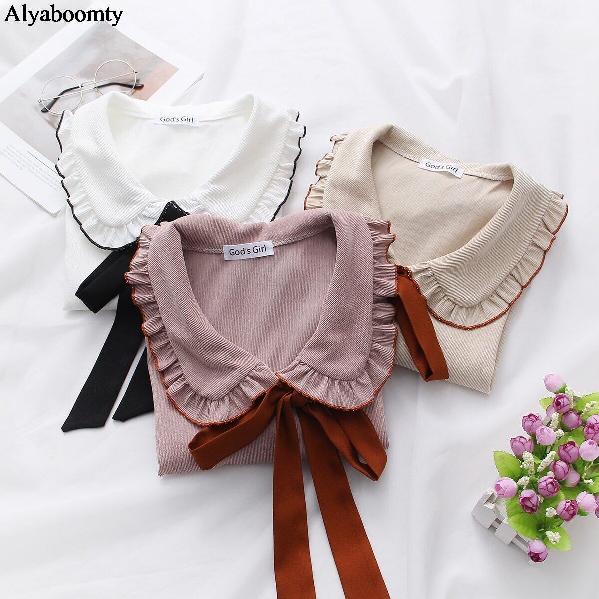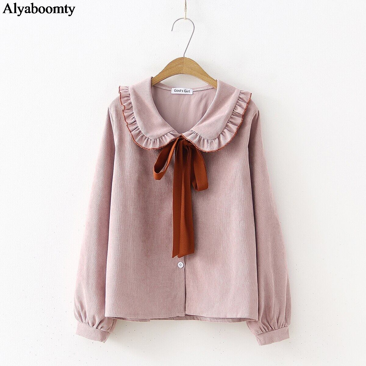 送料無料୨♥୧ ese森オータムスプリングレディースシャツ ピーターパンカラーホワイトアプリコットピンクルーズブラウス 可愛いリボンコーデュロイブルサ AOS28450829361