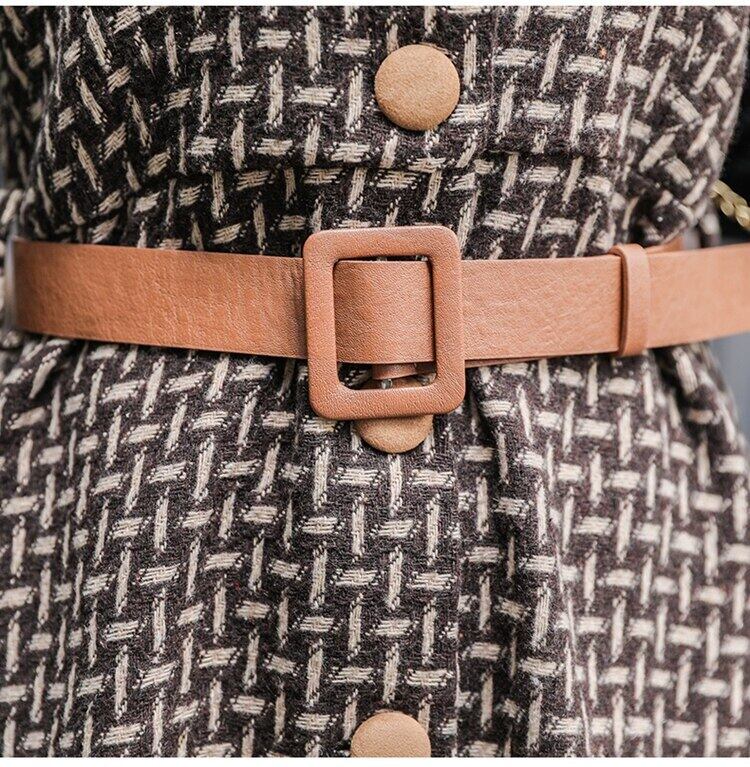 送料無料୨♥୧ イングランドスタイルオータムウィンターレディースドレス Vネック格子柄ウールノースリーブサッシ厚い AOS29388658673