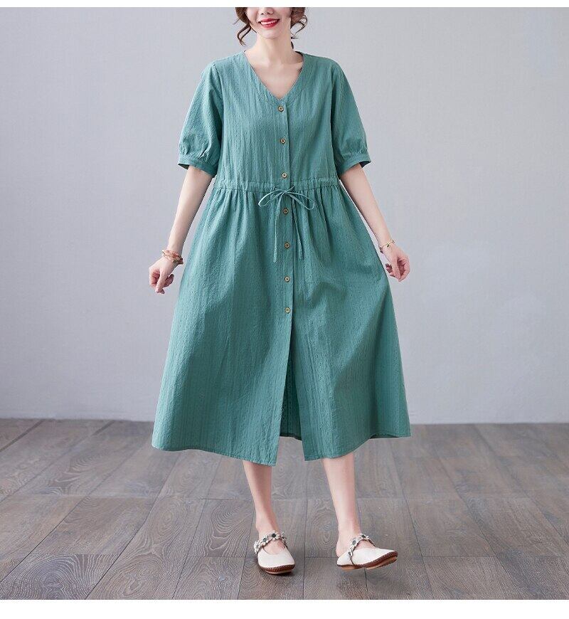 送料無料୨♥୧ 2021プラスサイズサマーレディースミディシャツ ドレス Vネックピンクグリーンコットンジャカードヴィンテージレースアップロング AOS72166221625
