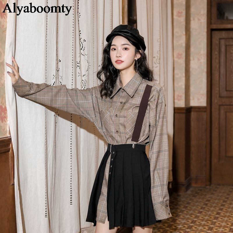 送料無料୨♥୧ ese原宿レディース2個セット パンクスタイル特大格子柄ストラップスプリットプリーツスカート ゴシックストリートウェアスーツ AOS30713404885