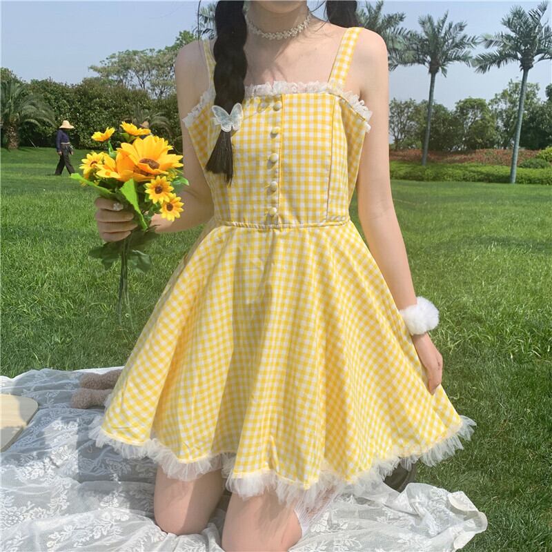 送料無料୨♥୧ 2021eseサマーレディースロリータミニドレス イエロー格子柄バックレスリボン可愛いレースフリルパーティー AOS76206122446