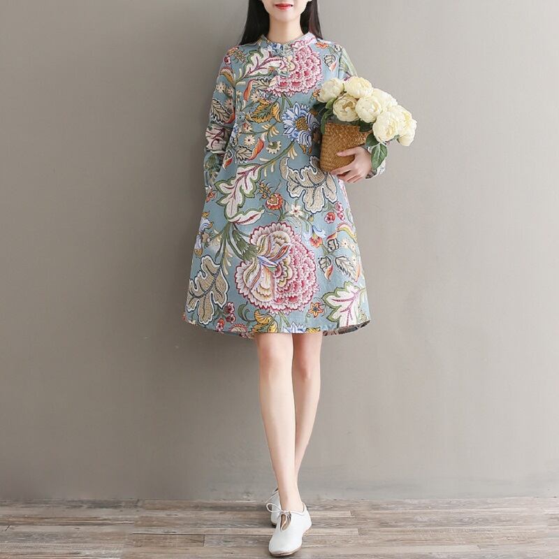 送料無料୨♥୧ 中国語自然派スタイルスプリングオータムミニドレス ゴージャスプリントフェミニーズベスティドスプラスサイズコットンレディース AOS85672784419
