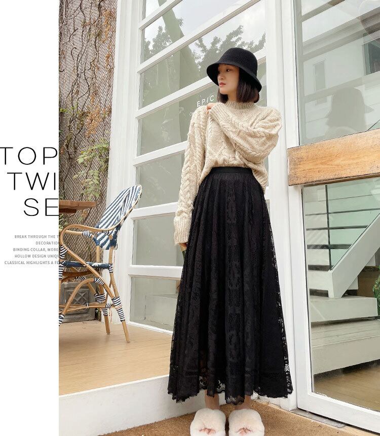 送料無料୨♥୧ シックスプリングオータムレディースマキシスカート ウェストブラックアプリコットホワイトホローでる妖精レースパーティーロング AOS13294832876