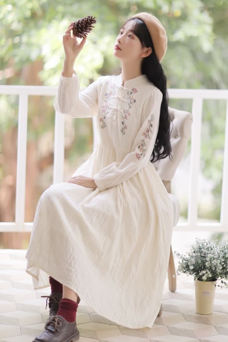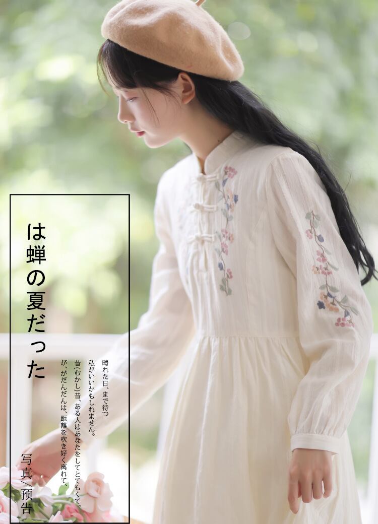 送料無料୨♥୧ 森オータムスプリングレディースミディドレス スタンドカラーカラーフローラル刺繍エスニックヴィンテージ長袖スリーブクリカル AOS36143395529