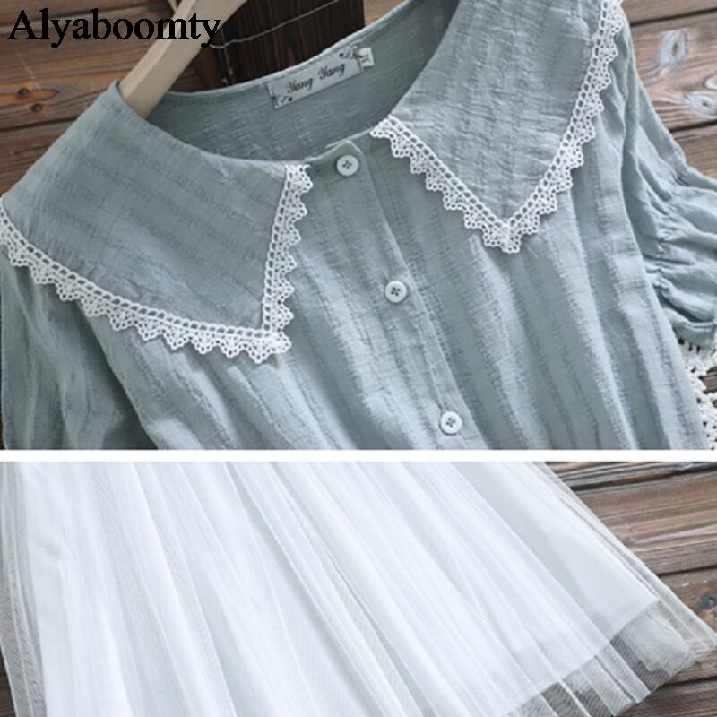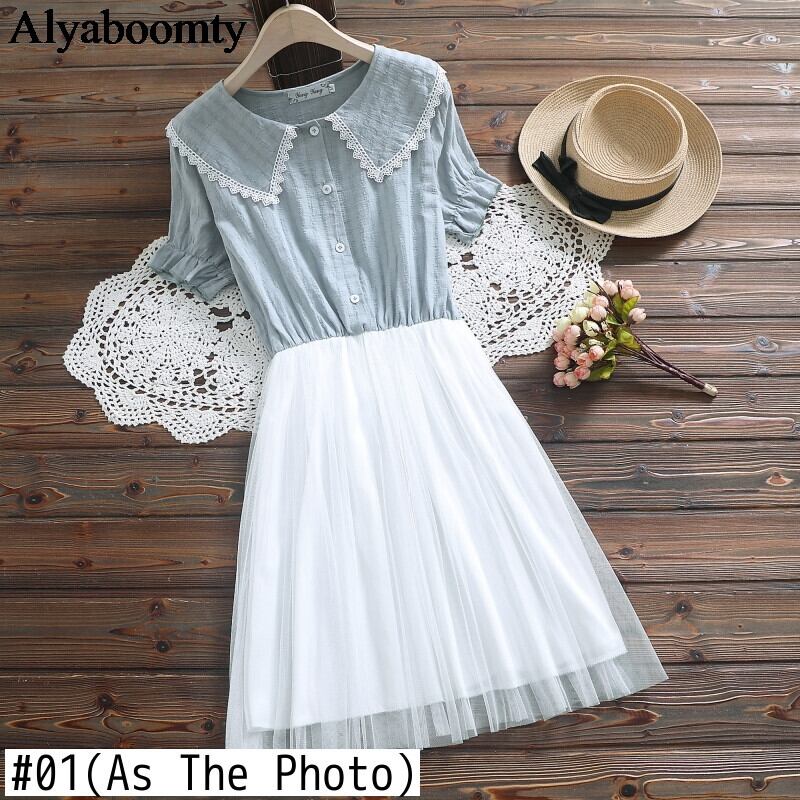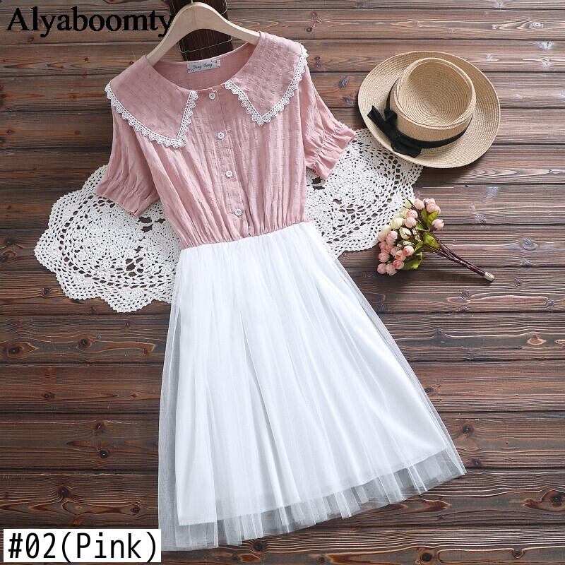 送料無料୨♥୧ ese森サマーレディース甘いドレス ピーターパンカラーレースピンクグリーンメッシュ半袖スリーブコットンチュールドレス ワンピース AOS81163918817