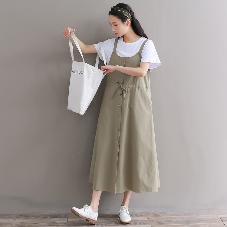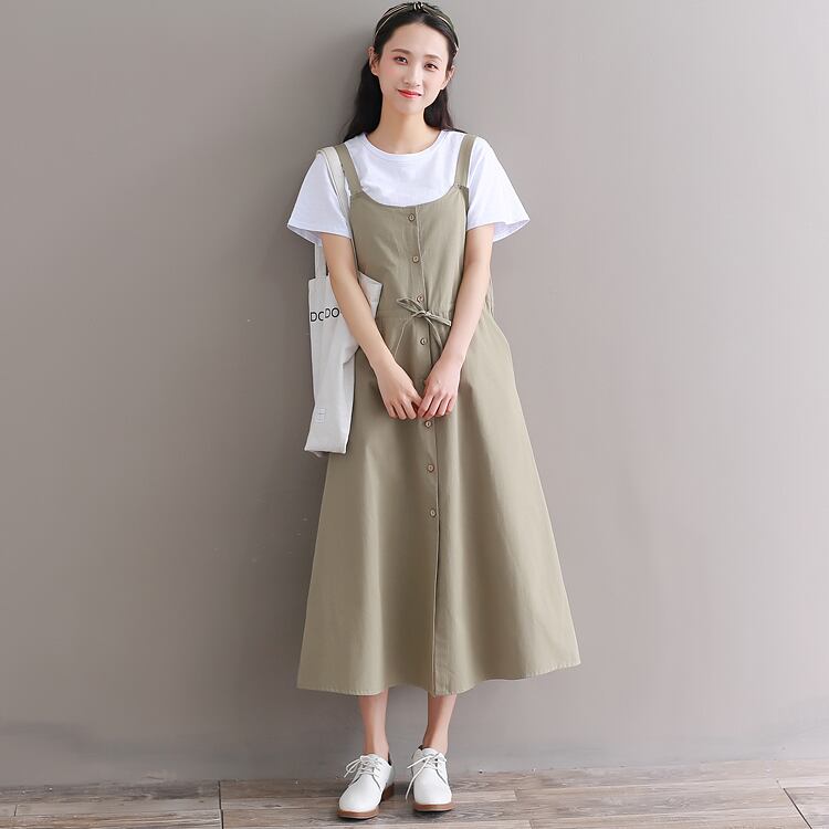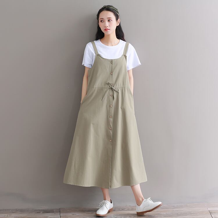 送料無料୨♥୧ スプリングサマーレディーススパゲッティストラップロングドレス ルーズコットンベスティドスノースリーブヴィンテージソリッド 森 AOS95648134446