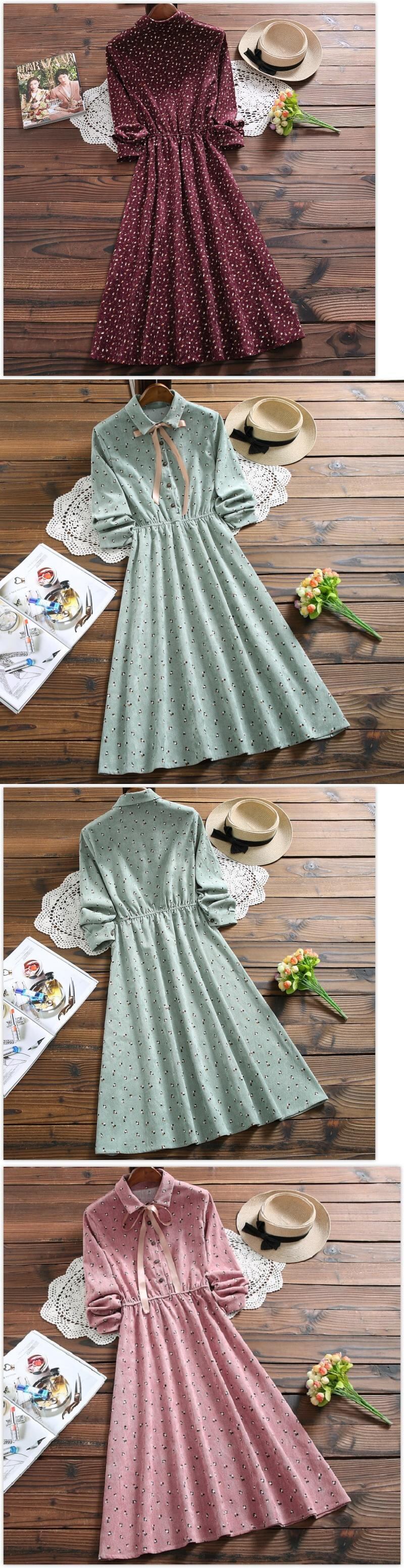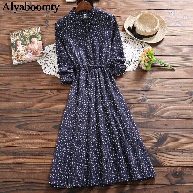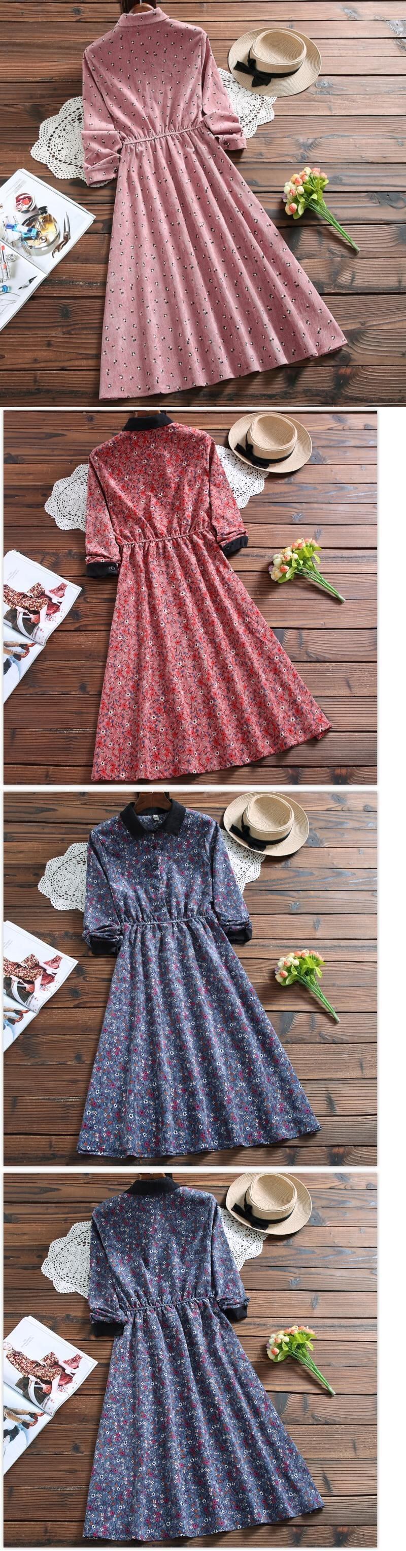 送料無料୨♥୧ 森オータムスプリングレディース甘いドレス 10断るカラーフローラルプリント柄草原シックコーデュロイミディ AOS17946007419