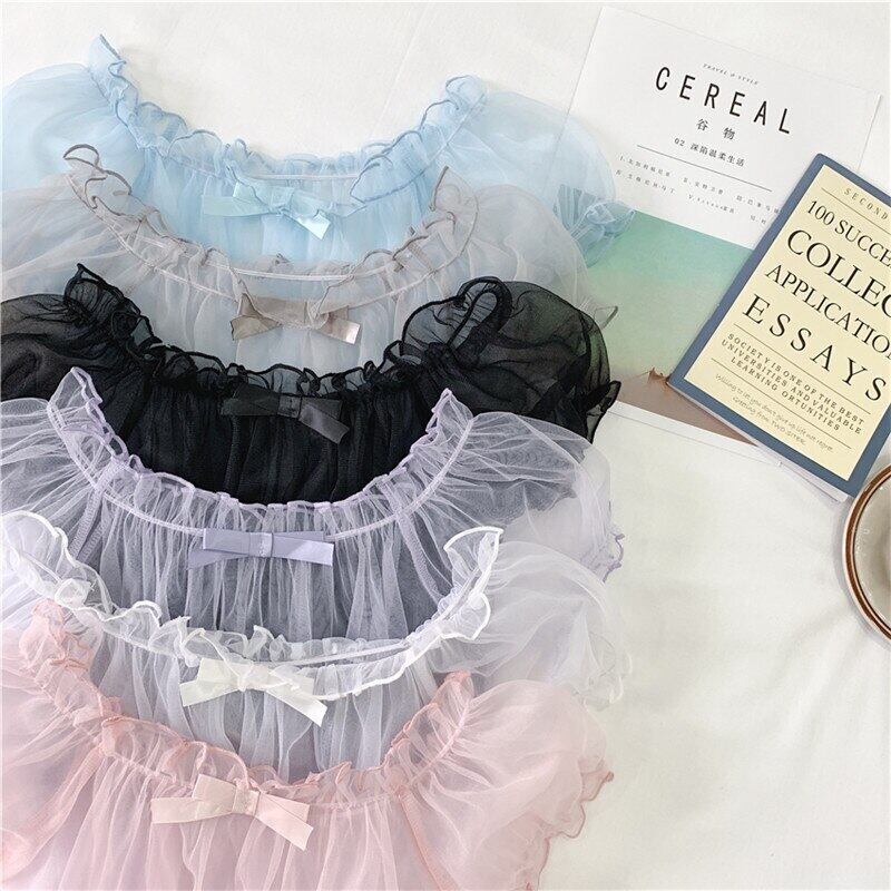 送料無料୨♥୧ eseロリータスタイルサマーレディース収穫トップス カラーホワイトブラックグレーピンクブルー紫のメッシュブラウス 可愛い甘いブルサ AOS90019525742
