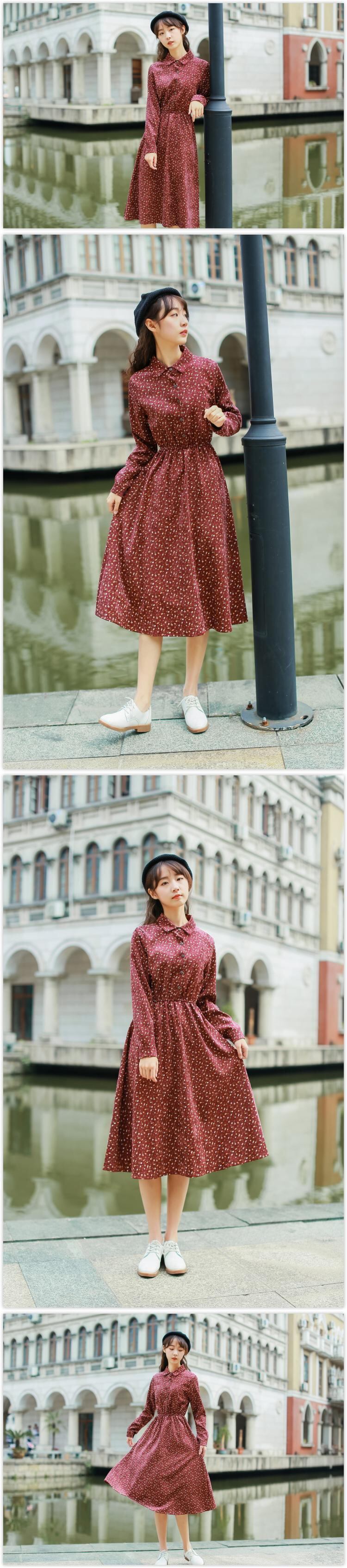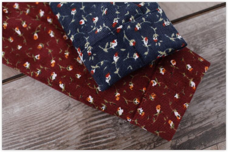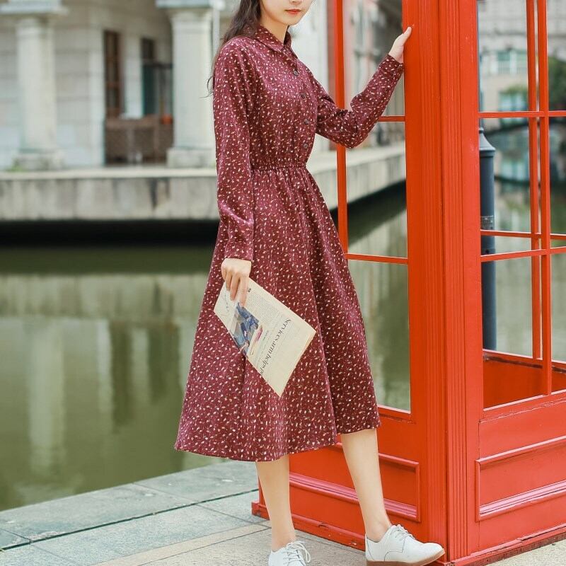 送料無料୨♥୧ eseプレッピースタイル秋ウィンターレディースドレス ネイビーブルーワインレッドフローラルスタンダードベスティドスゴージャスコーデュロイ甘いミディ AOS24236445027