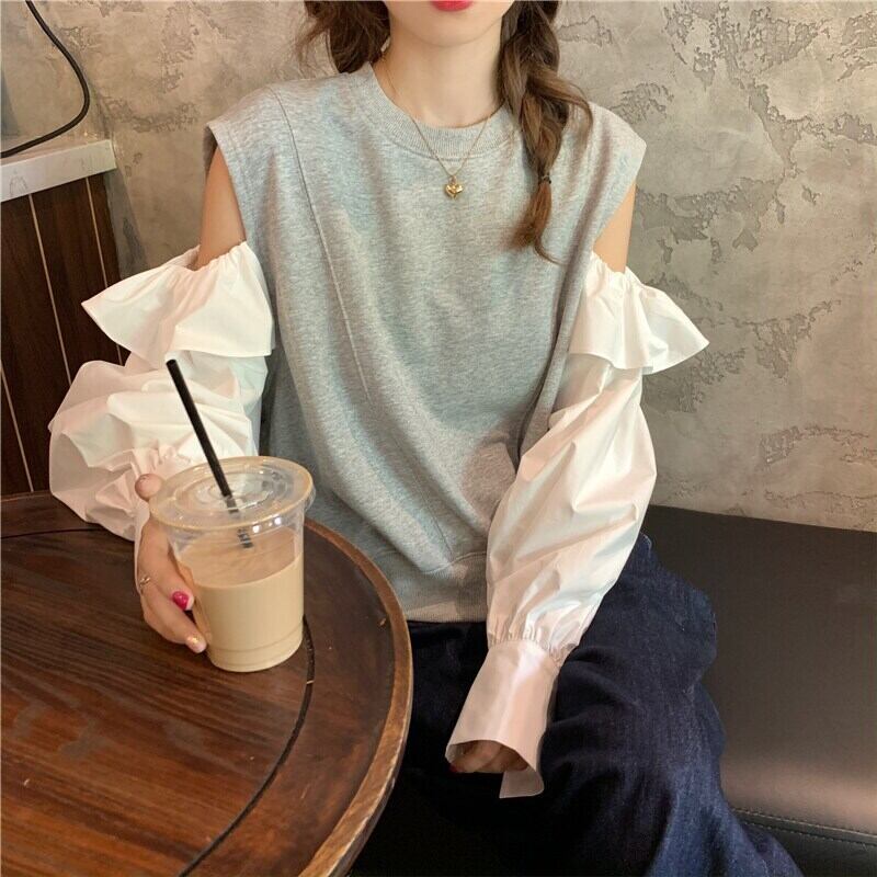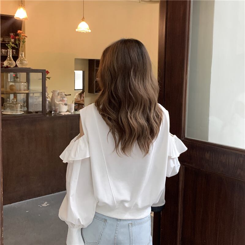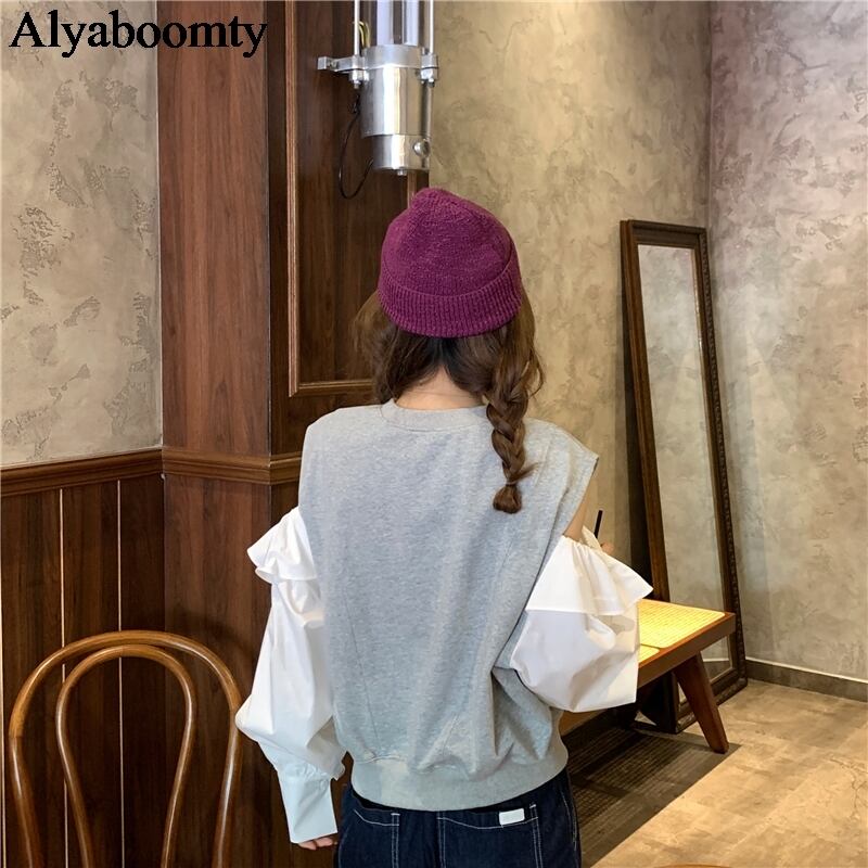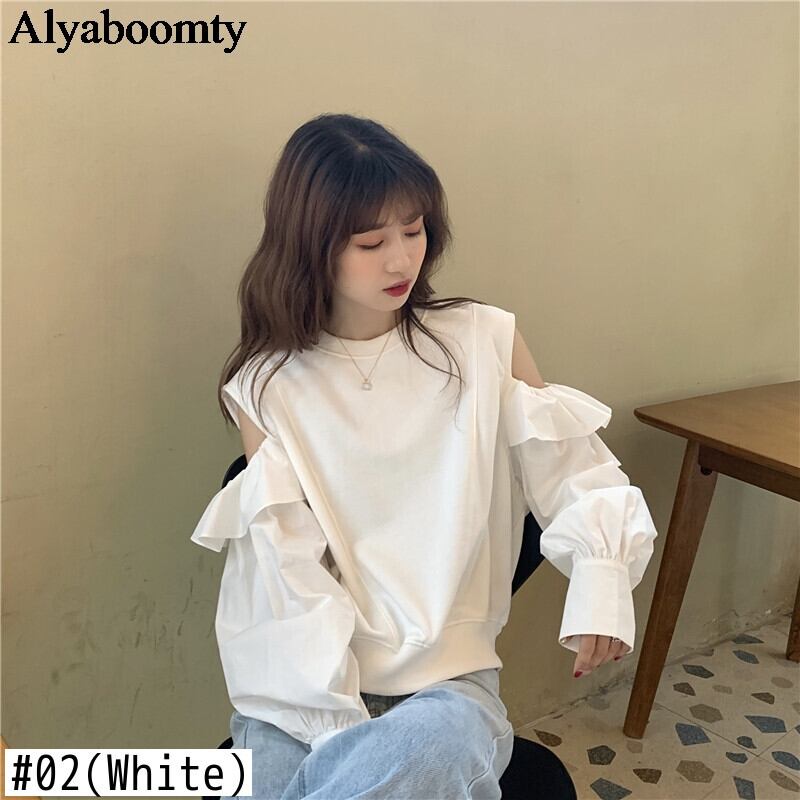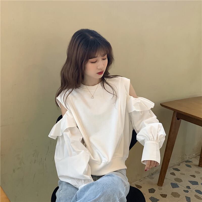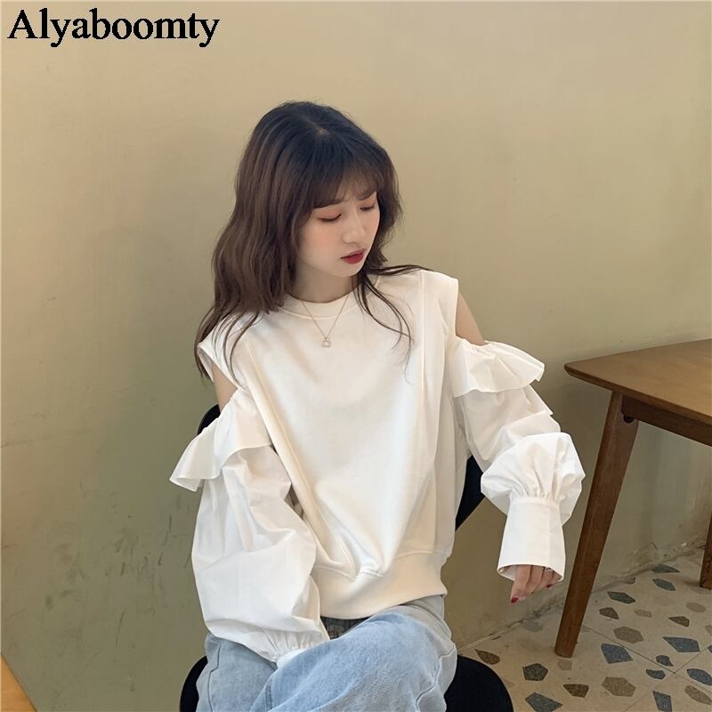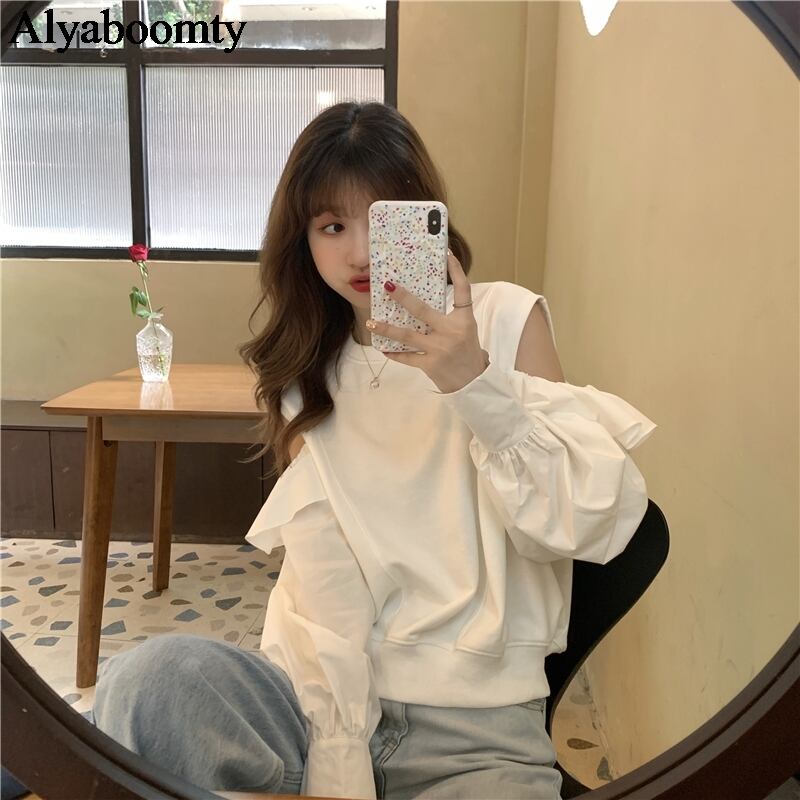 送料無料୨♥୧ ese原宿オータムスプリングレディースパーカーホワイトグレーオフショルダーコットンスウェット オルチャンスタイリッシュルーズプルオーバー AOS8152210692