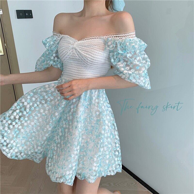送料無料୨♥୧ 2021サマーレディースフローラルドレス 平方カラーレースパッチワーク刺繍甘いパフスリーブ妖精ミニ AOS44879290714