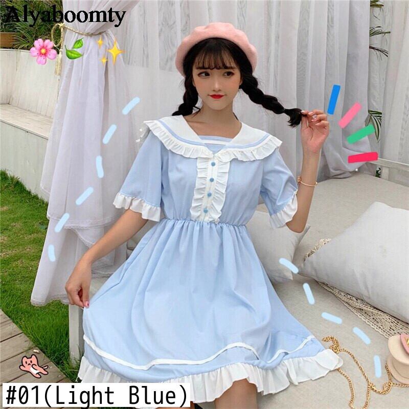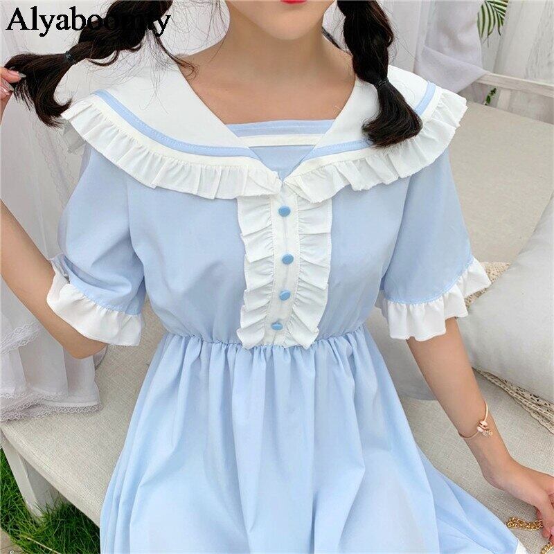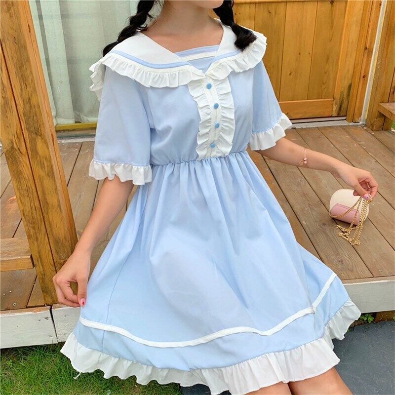 送料無料୨♥୧ eseサマーレディースロリータドレス ピーターパンカラーブルーウェストフレアスリーブフリル AOS26755965821