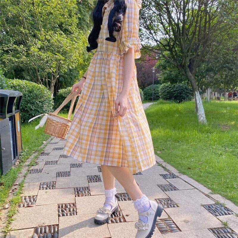 送料無料୨♥୧ eseロリータスタイルサマーレディース可愛いドレス ピーターパンカラー紫のイエロー格子柄ルーズ半袖スリーブドレス ワンピース AOS37484886026