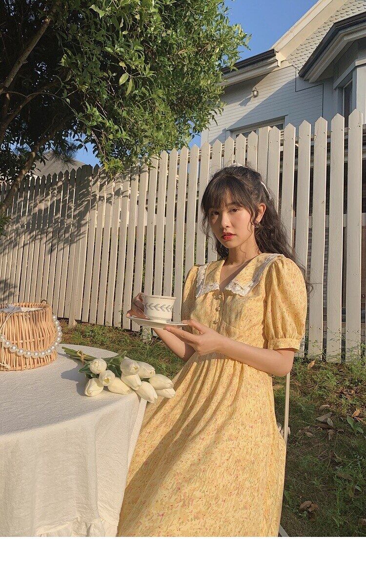 送料無料୨♥୧ 2021サマーレディース草原シックミディドレス 断るカラーとレースブルーイエローフローラルプリント半袖スリーブ AOS31145416869