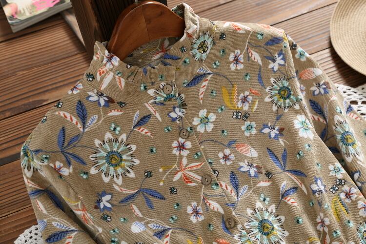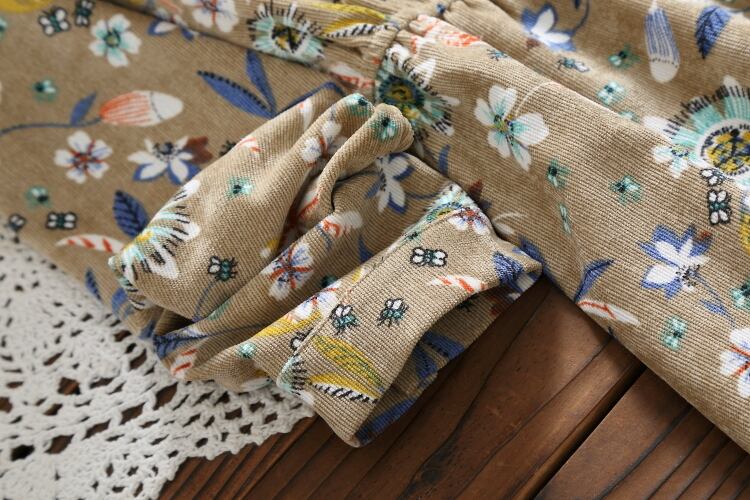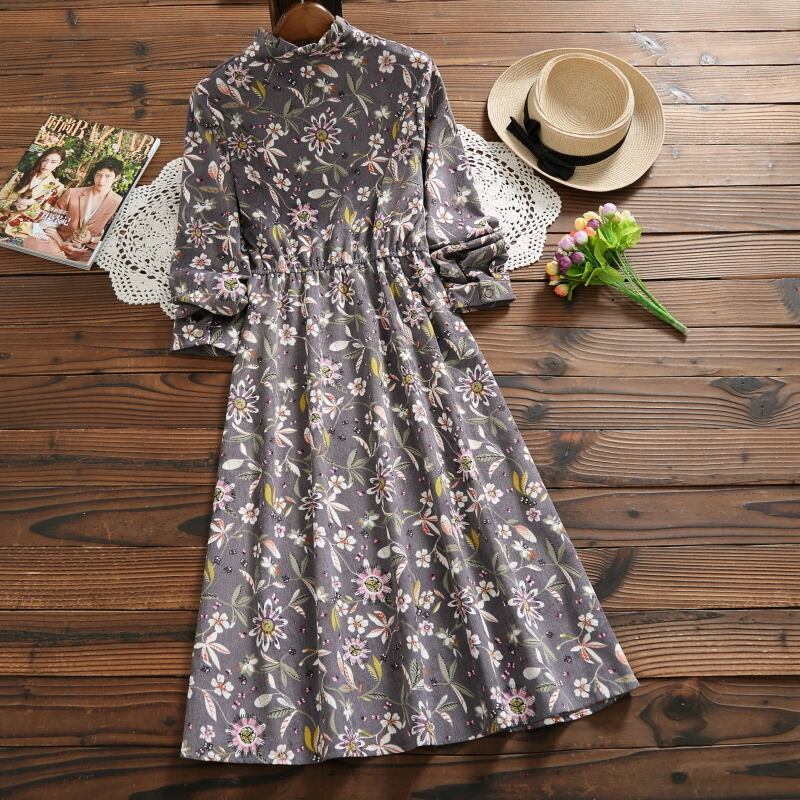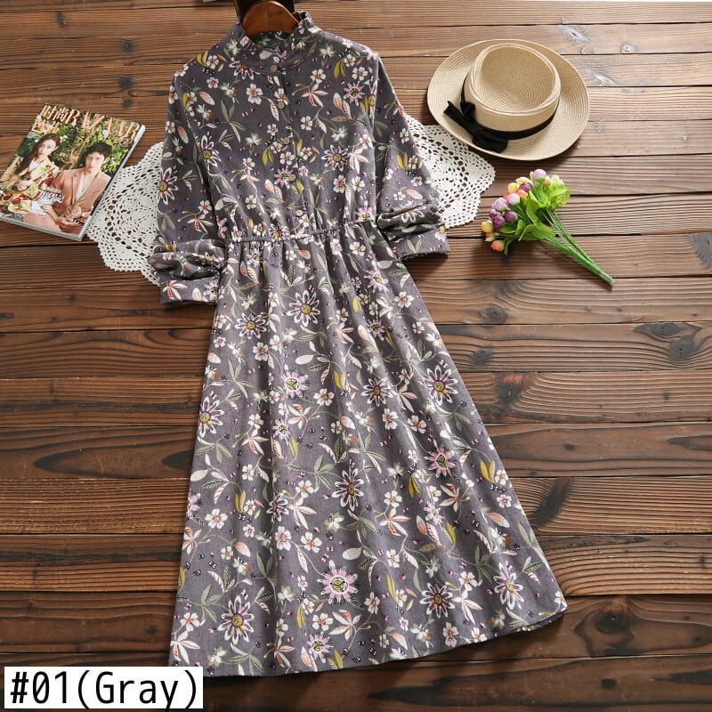 送料無料୨♥୧ オータムスプリングレディースフローラルミディドレス カラーヴィンテージグレーカーキベスティドス長袖スリーブコーデュロイ AOS10407567616