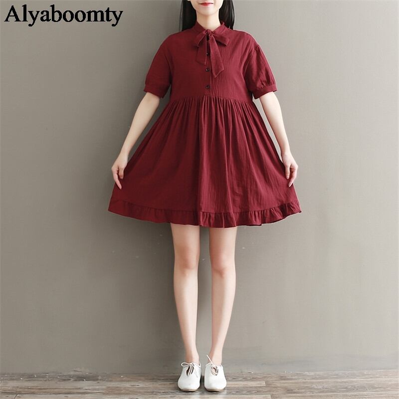 送料無料୨♥୧ ese森サマーレディースミニドレス リボンカラーワインレッドルーズ半袖スリーブコットン甘いフリル可愛いドレス ワンピース AOS5036256901