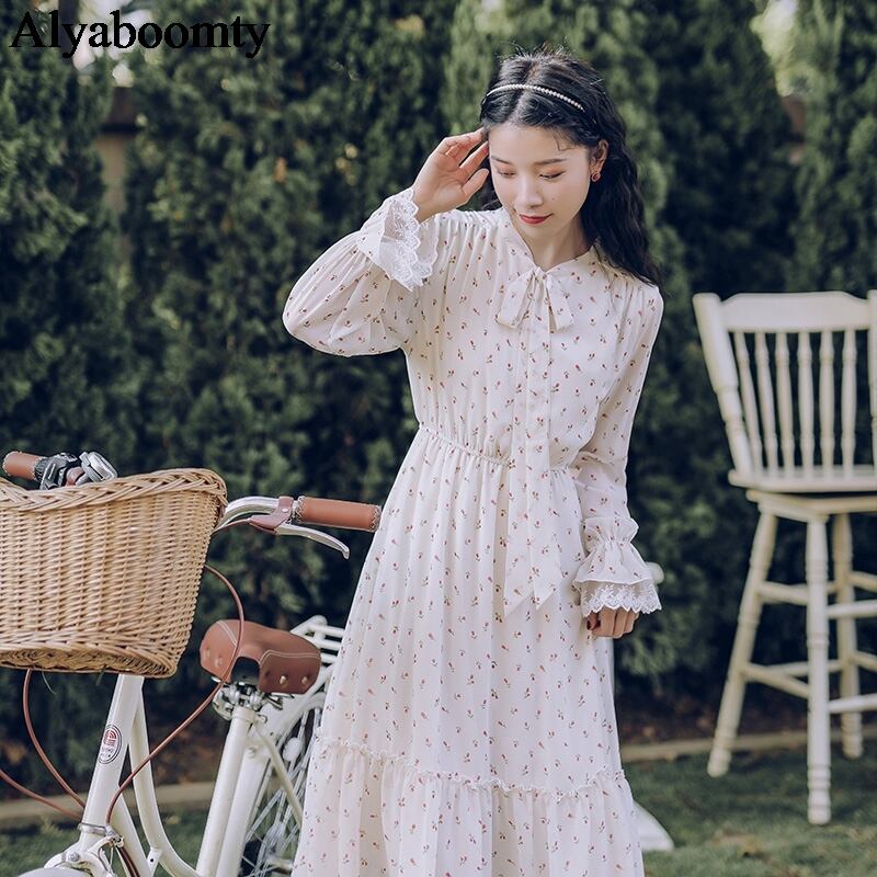 送料無料୨♥୧ オータムスプリングレディースシックロングドレス alyaboomtyリボンカラーシフォンフローラルプリント AOS4259409918