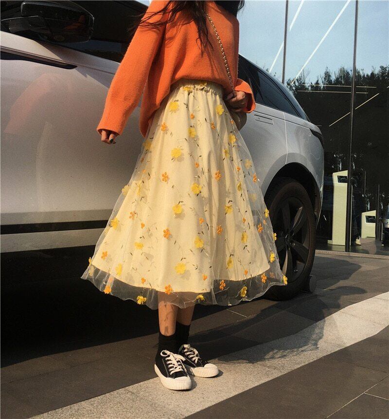 送料無料୨♥୧ ese森スプリングサマーレディーススカート ウェストイエローフローラル刺繍メッシュミディシックチュール AOS48153693342