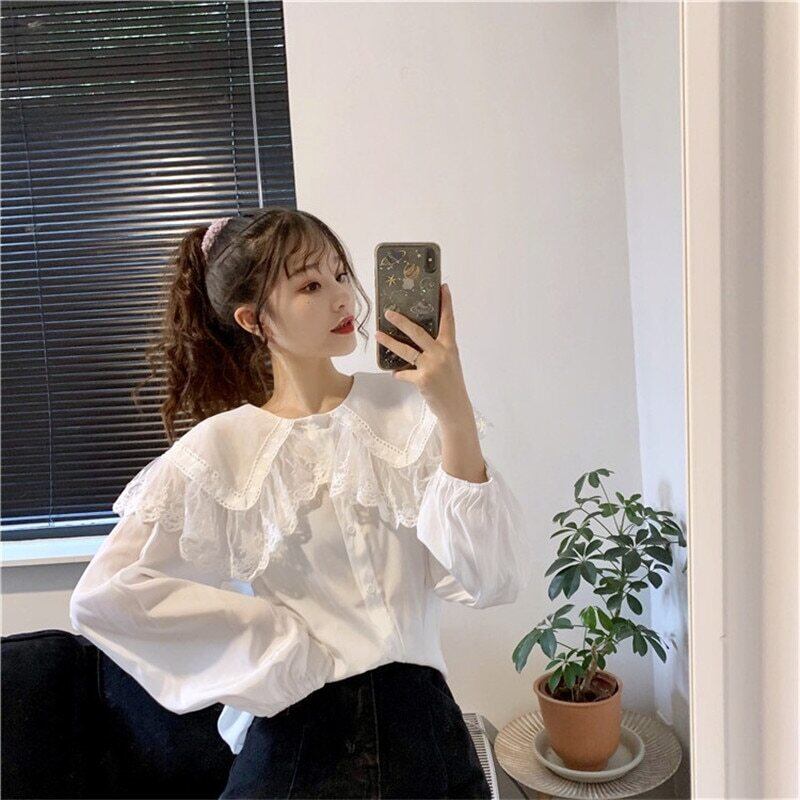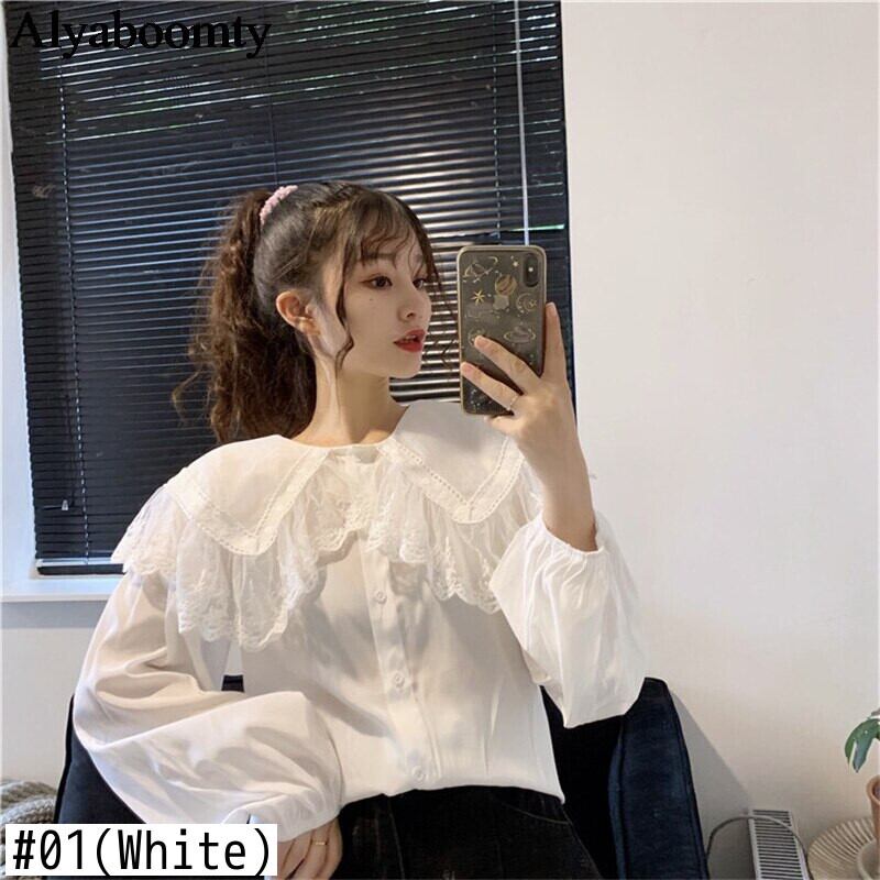 送料無料୨♥୧ ese森スプリング秋レディースブラウス ピーターパンカラーとレースフリルホワイト可愛い全試合シャツ AOS66743992947