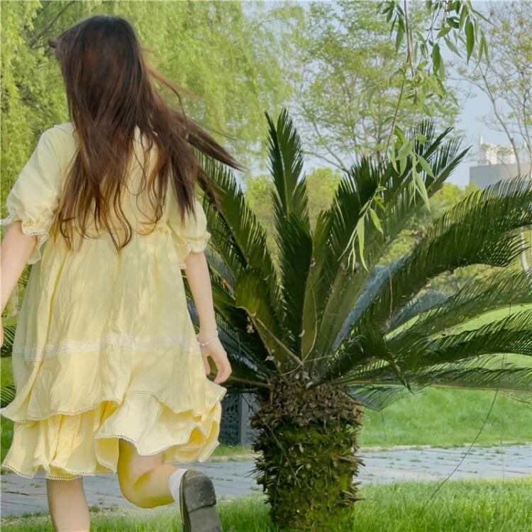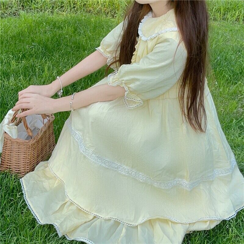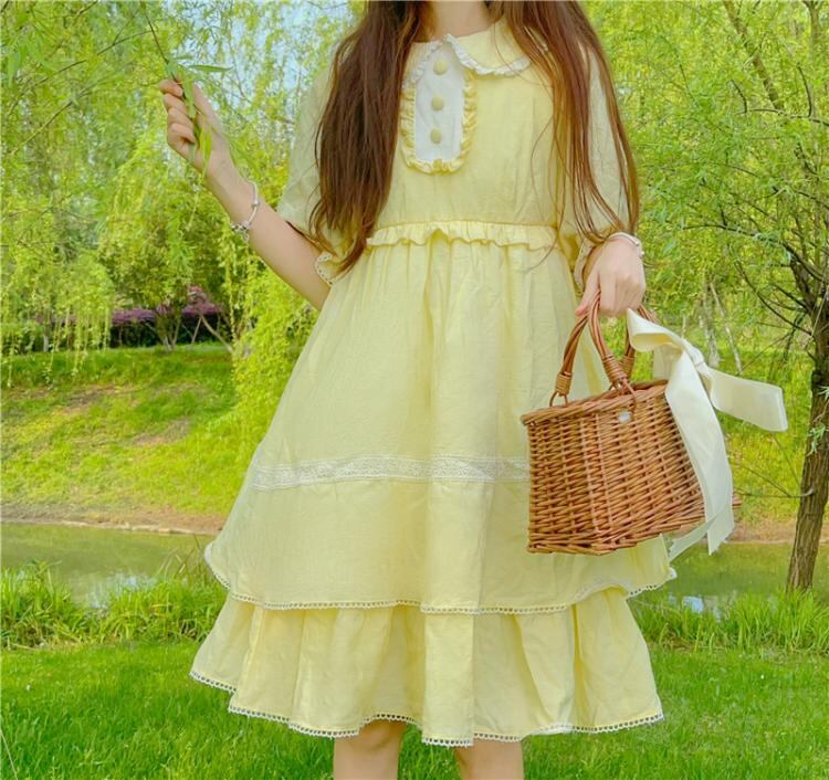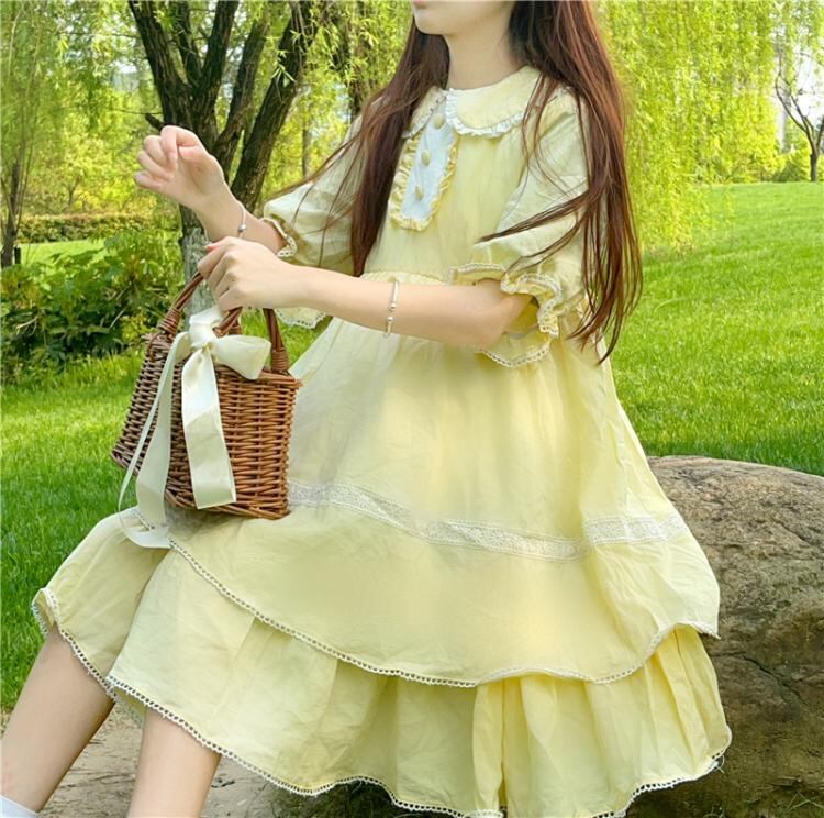 送料無料୨♥୧ 2021eseサマーレディースロリータドレス ピーターパンカラーイエローフリル可愛いパーティードレス ワンピース AOS55668168360