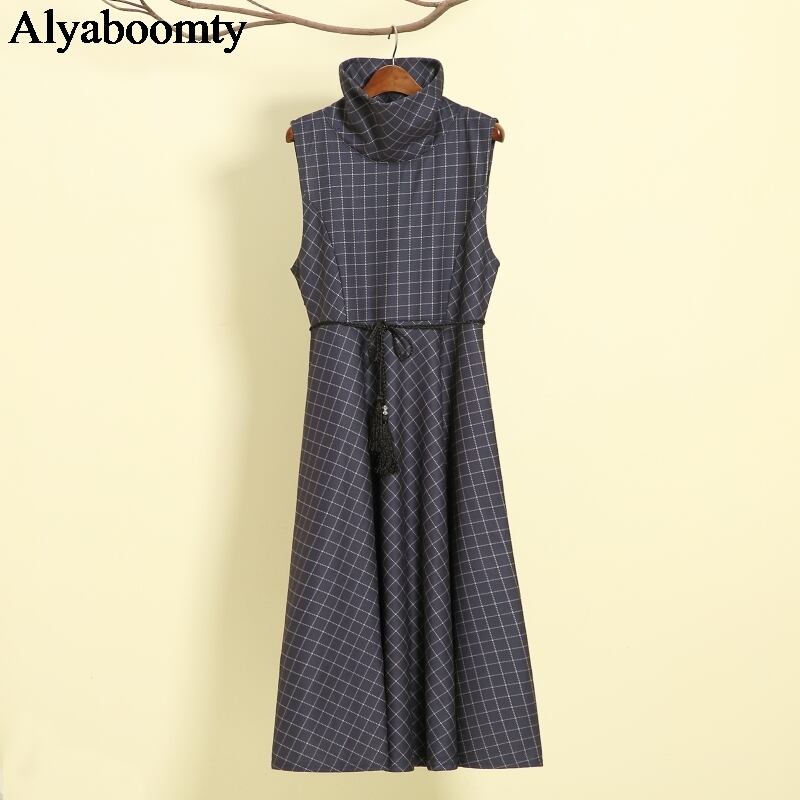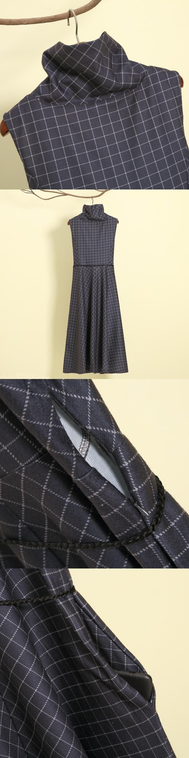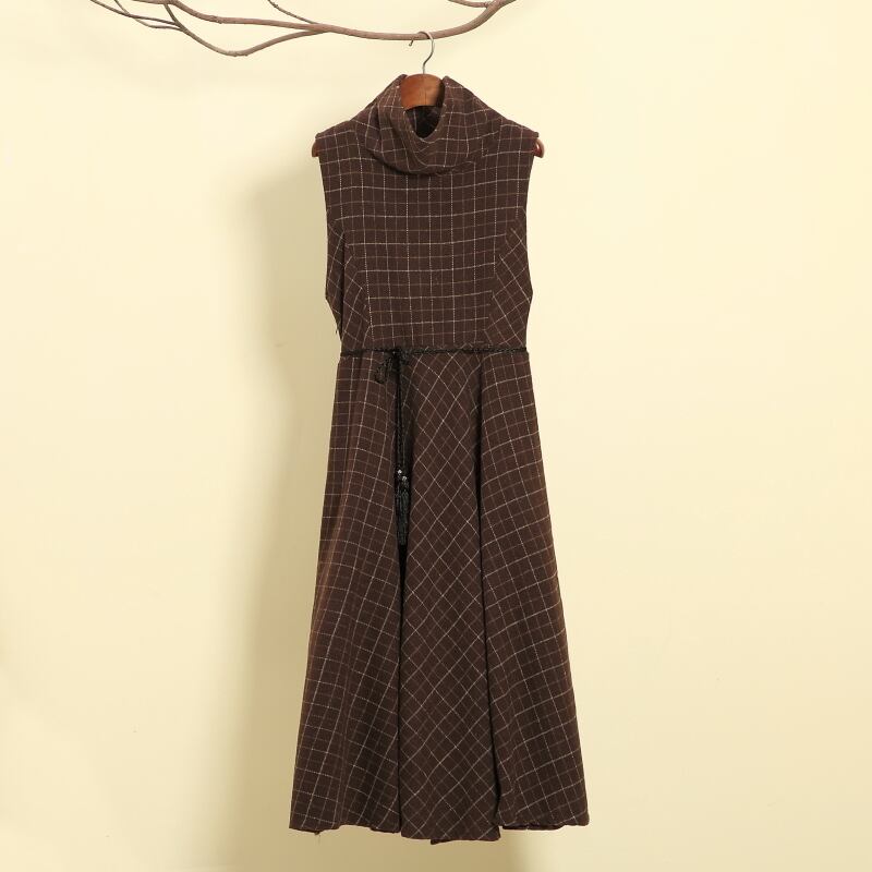 送料無料୨♥୧ 2021オータムウィンターレディースロングドレス タートルネックグレーコーヒー格子柄ノースリーブヴィンテージ AOS70783303