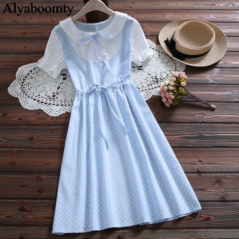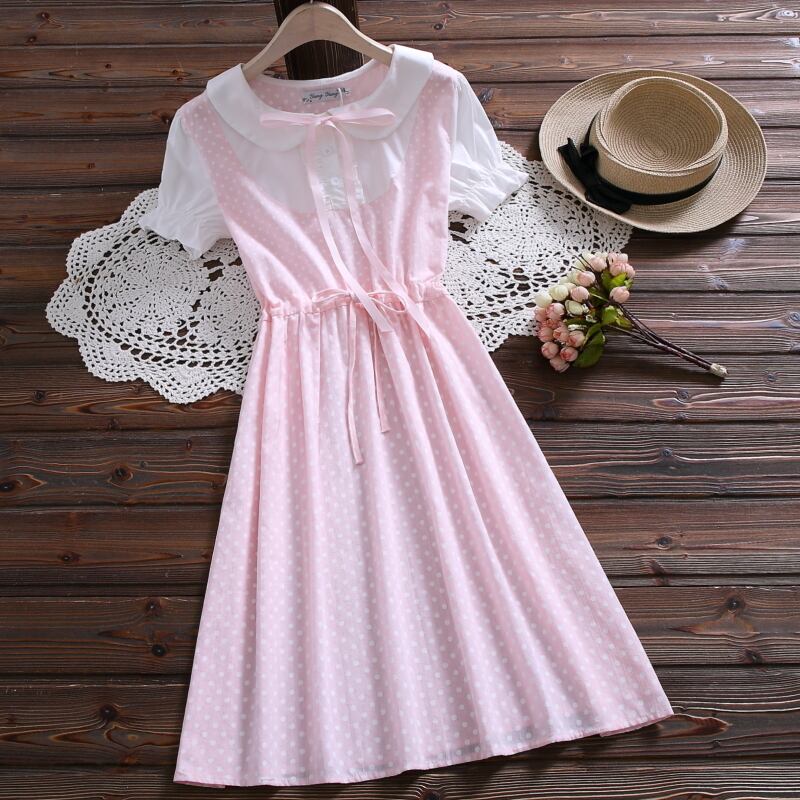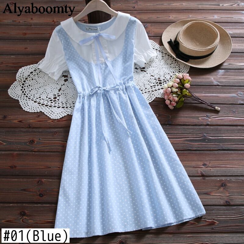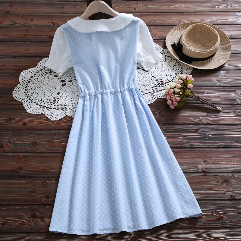 送料無料୨♥୧ 2021プレッピースタイルサマーレディース可愛いドレス ピーターパンカラーブルーピンクパッチワーク水玉リボンレースアップショートドレス ワンピース AOS18379846839