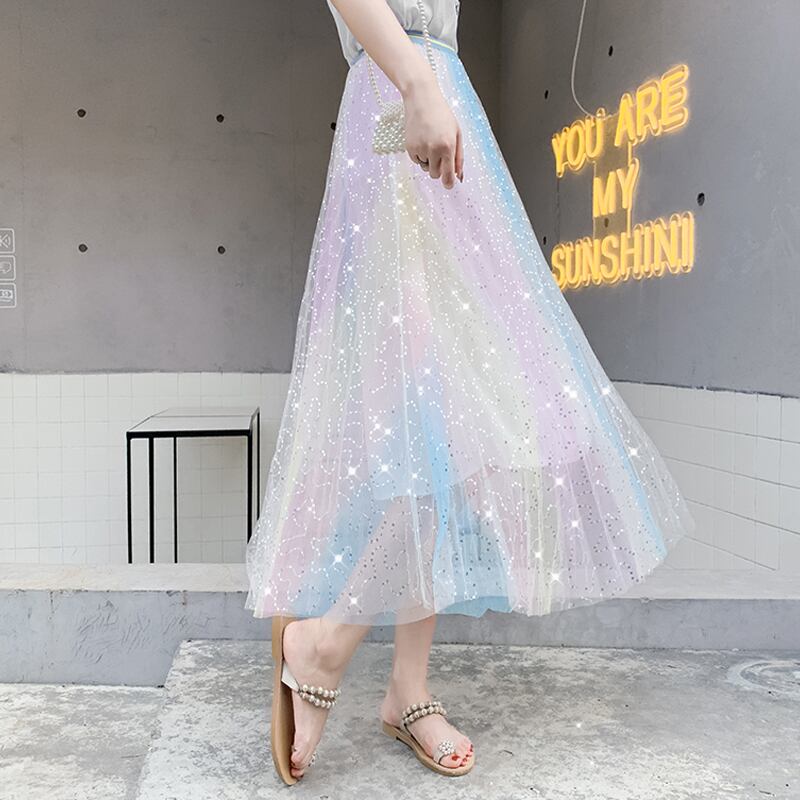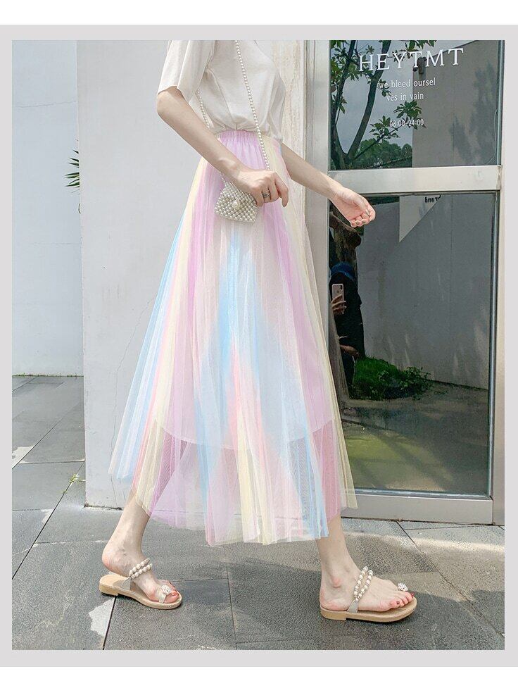送料無料୨♥୧ サマーオータムレディースロングスカート ウェストパステルメッシュ甘い休日チュールプリーツ AOS89491103850